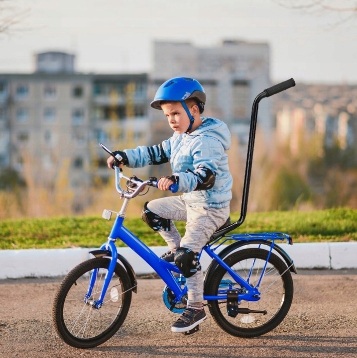 Навчальна ручка, встановлена на дитячому велосипеді. Це може допомогти батькам керувати своїми дітьми, які навчаються їздити на велосипеді. Це спосіб забезпечити свою дитину впевненістю та контролем під час руху.