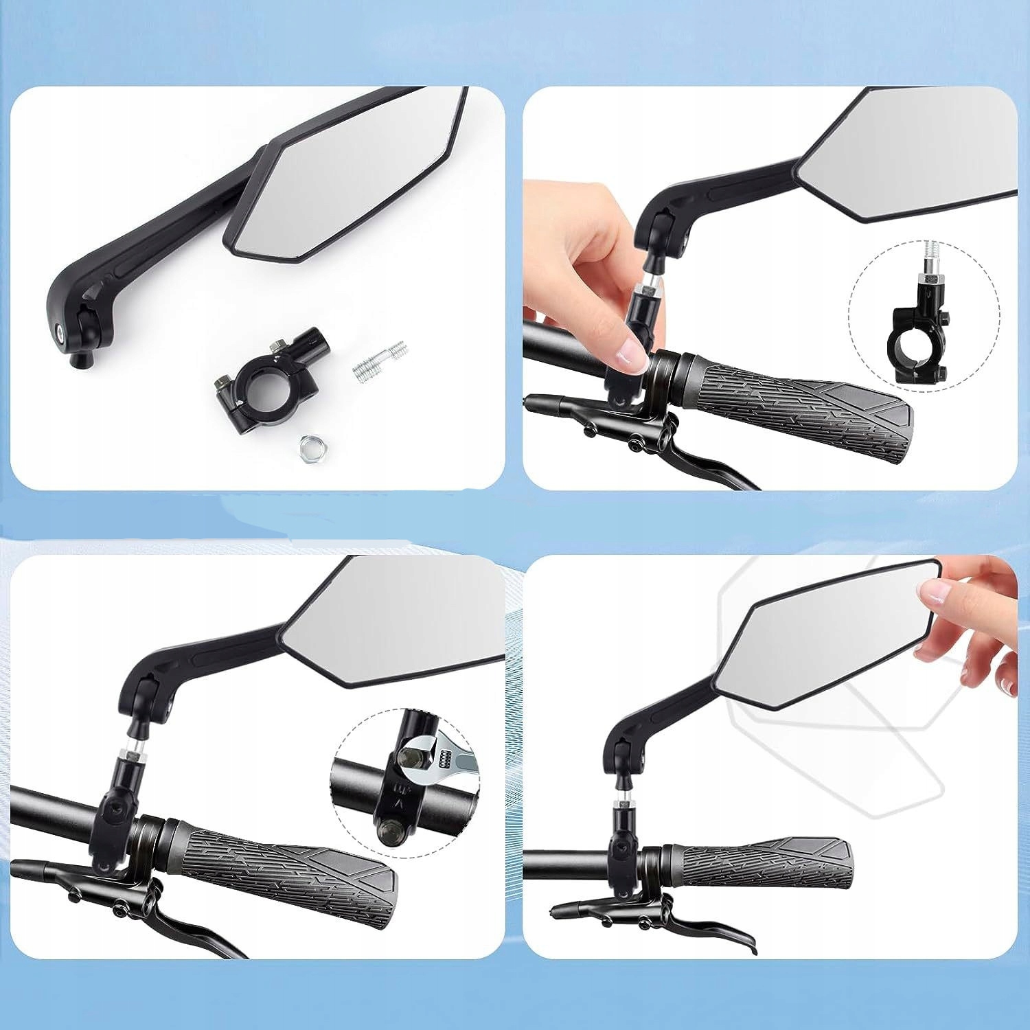【обертання на 360 °】 наші велосипедні дзеркала мають гнучкий кріплення ремінця внизу. Дзеркало заднього погляду можна відрегулювати залежно від ваших потреб. Слідкуйте за дорогою під вибраним кутом, без мертвих точок, простіше та зручніше.
