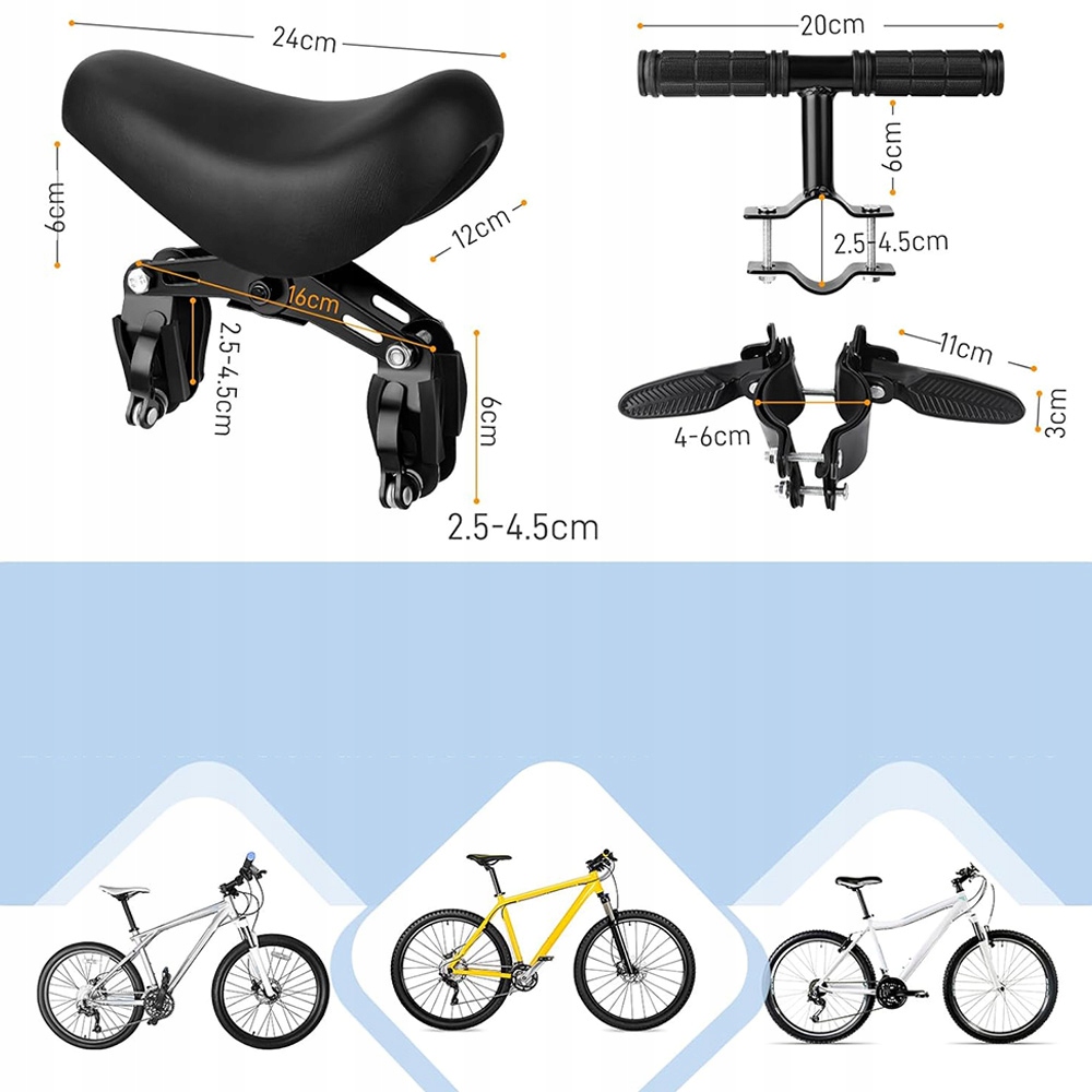 Завдяки регульованому дизайну, сидіння нашого дітей підходить для всіх типів гірських велосипедів; Міцний матеріал забезпечує високу здатність до навантаження, підходить для дітей різного віку та з різними розмірами від 2 до 6 років, гарантуючи, що дитина сильно та безпечно сидить на сидінні.