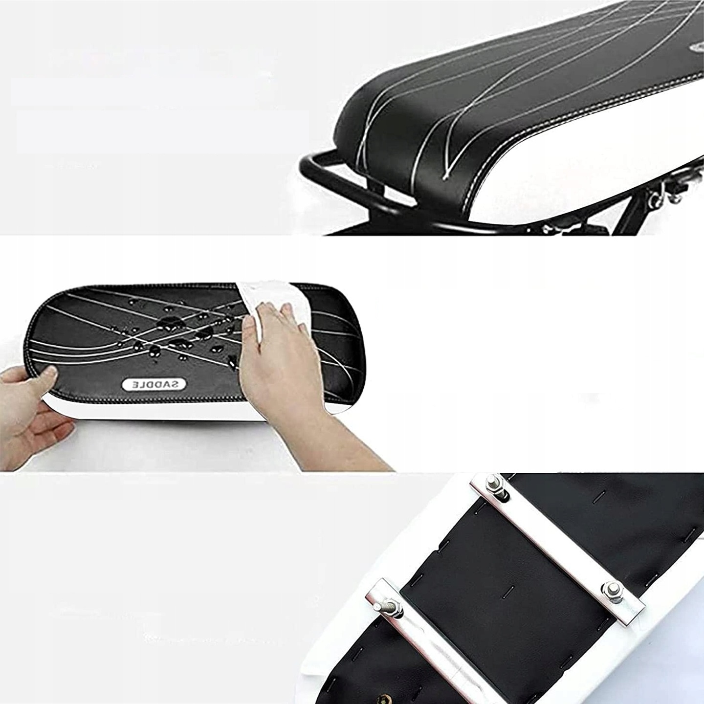 шкіра PU + губка. У дощові дні можна не хвилюватися, що подушку заллє. Просто протріть поверхню паперовим рушником і можете продовжувати використовувати. Товста губка дуже м'яка і зручна. Розширення та потовщення сидіння та спинки велосипеда забезпечують комфортне положення для сидіння.