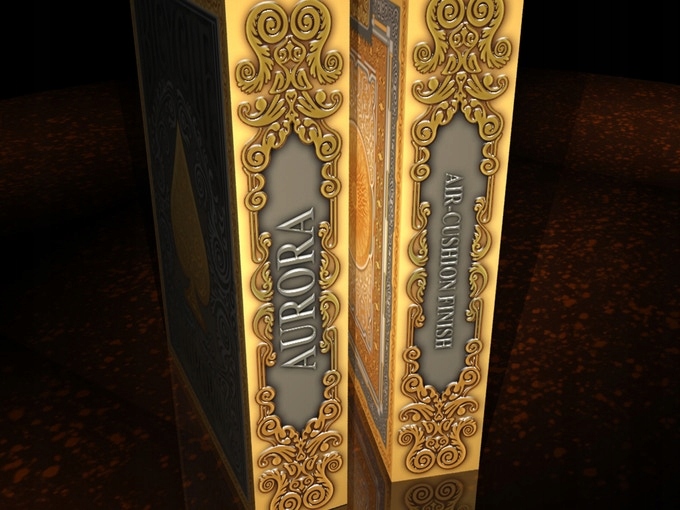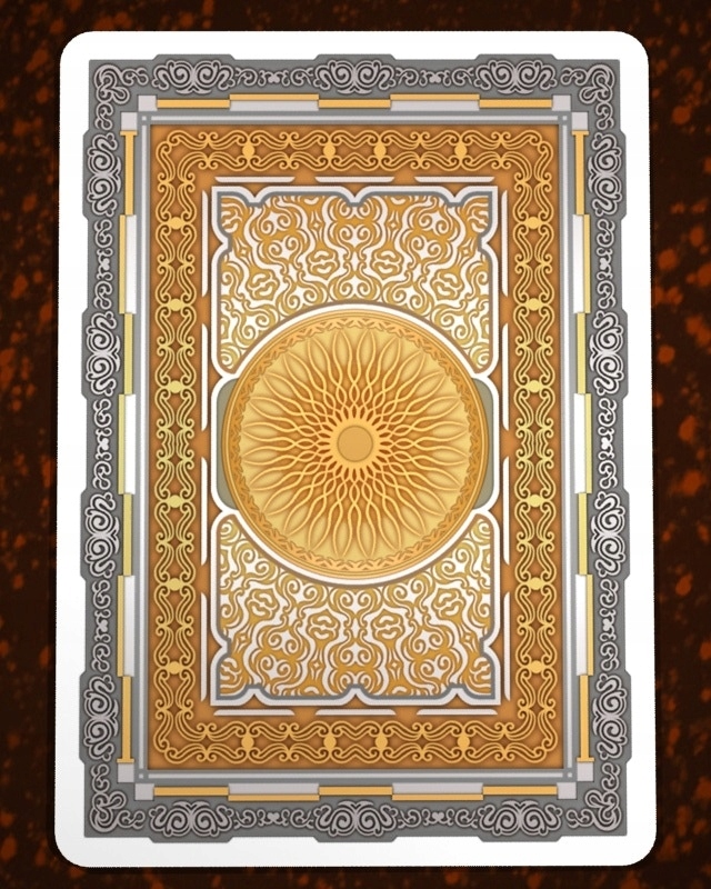 Золотий колір (фігури карт) із зображенням схід сонця ... та срібла (пронумеровані картки), що представляє схід сонця, темрява. Сонце розташоване в центрі випусків картки. Ви дивитесь на талію Аврори в тисненій золотих фользі з металевою чорнилою друкованою фольгою.