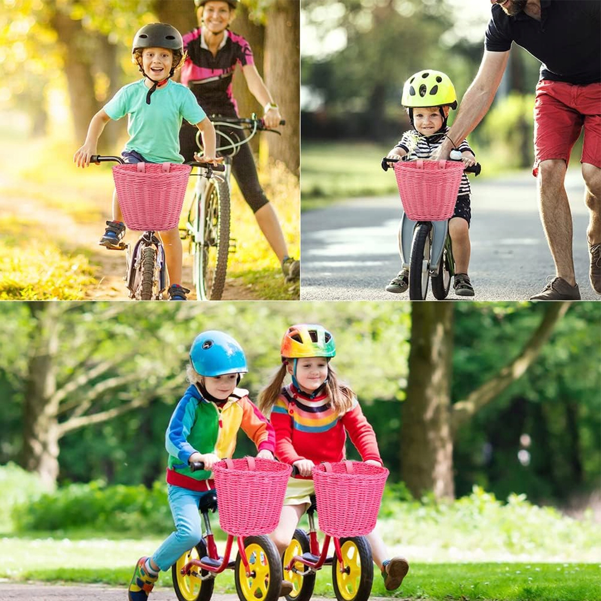 【Висока якість】 Наші велосипедні кошики для дітей підходять для дівчат, хлопців та дітей, сплетених вручну, красиво та дуже довговічно. Велосипедний кошик витканий з плетеного, що нагадує пластикову трубку, швидко висихає після дощу, водонепроникний і стійкий до цвілі, стійкий до сонячного світла та падіння, м’який і пластик. Розміри близько 20*16*15,5 см (довжина*ширина*висота).