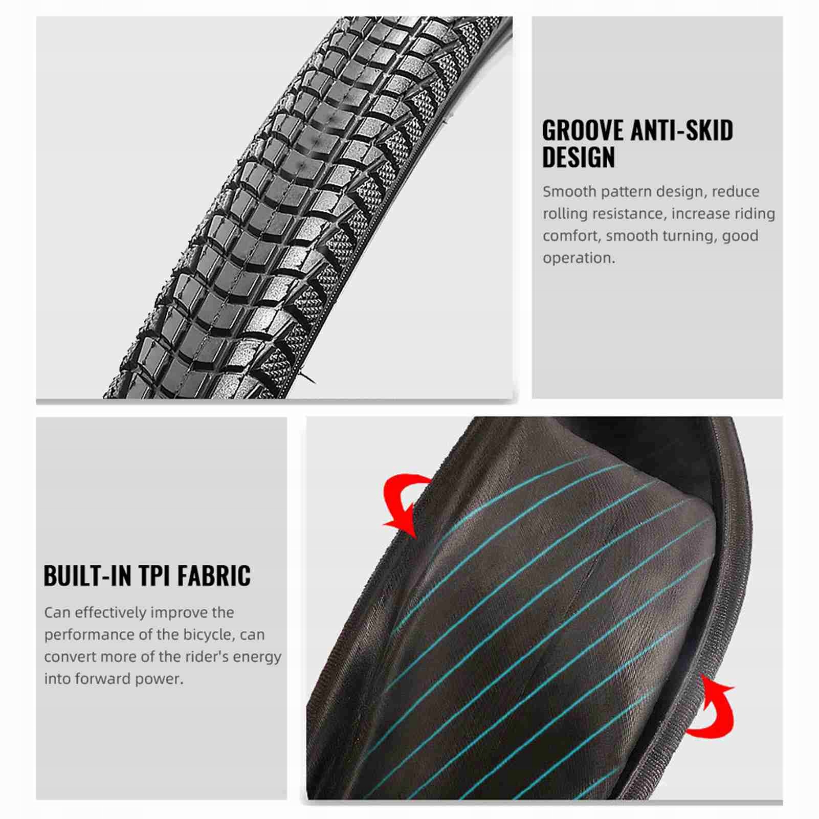 - Цей набір велосипедних шин, виготовлений із змішаного гумового матеріалу, внутрішньої трубки + зовнішньої структури трубки. Шини легші, тонші та стійкіші до тиску. Проект покупки канавки має хороший дренаж і запобігає ковзанню в дощові дні. 4 спорт.