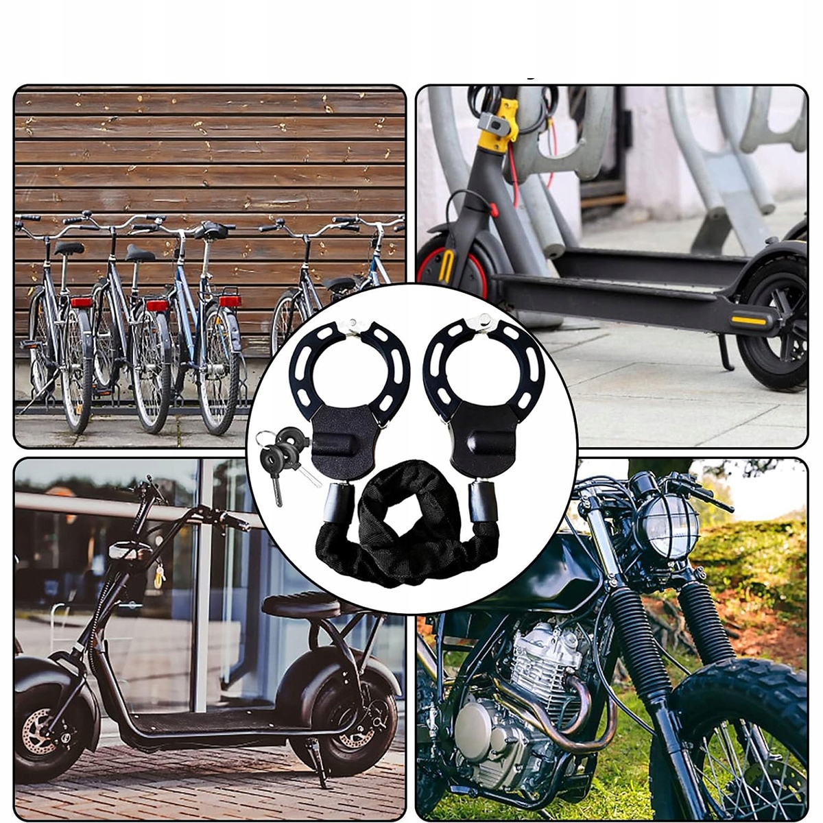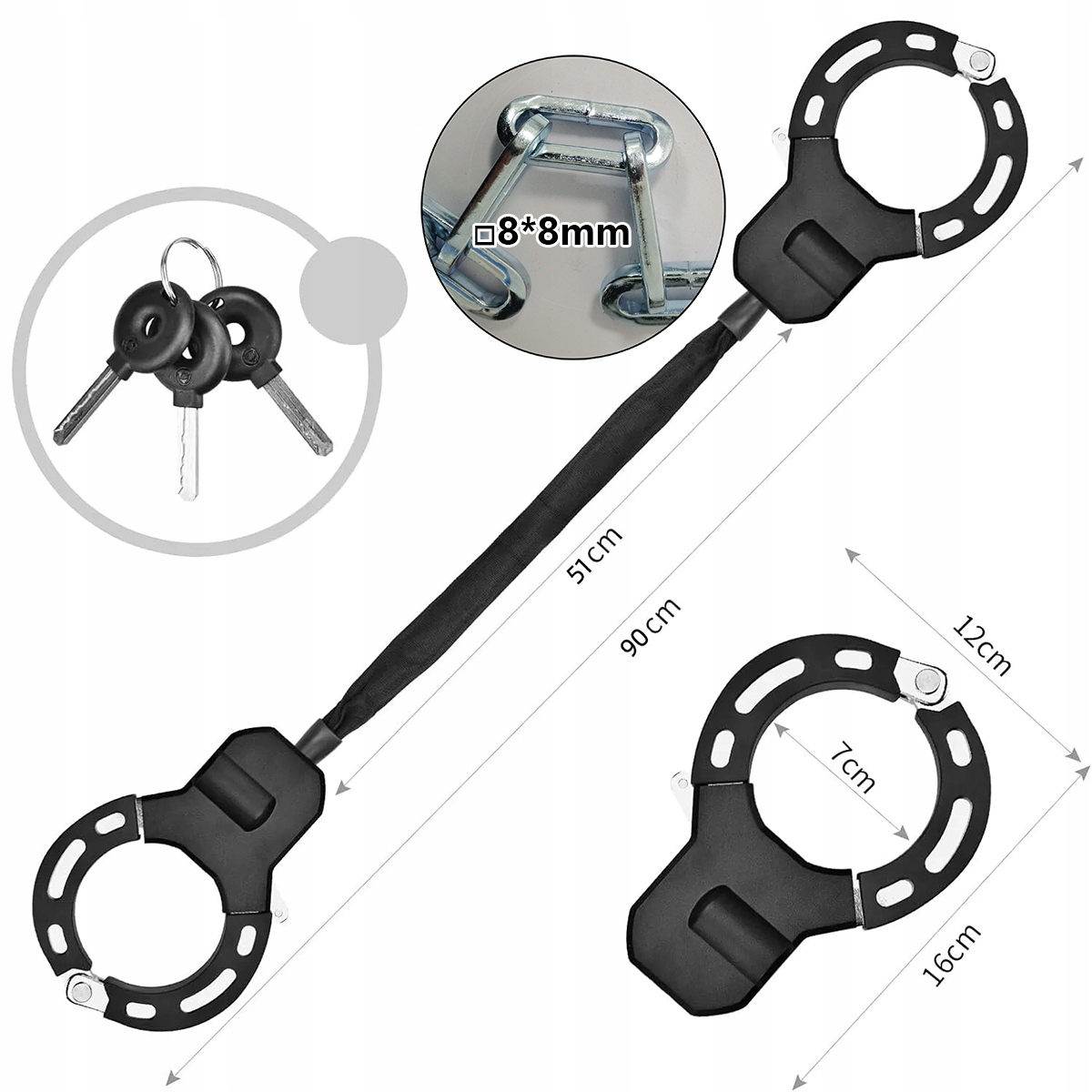 - Багатофункціональний замок: Замок наручника виготовлений із затвердженої сталі, із загальною довжиною (приблизно) 90 см у випадку блокування ланцюга та довжини (приблизно) 50 см у випадку частини ланцюга. Наш ланцюг - це квадратний ланцюг з розміром 8 мм * 8 мм, виготовленого зі спеціальної сталі, що в 10 разів сильніший, ніж гірший круглий ланцюг! Він ідеально підходить для електричних скутерів, електричних велосипедів, велосипедів та сходів, дитячих кодів, мотоциклів, огорожі тощо. Простим блокуванням та розблокуванням одним клацанням ви можете швидко та легко закріпити свій електричний скутер. Завдяки цій блокаді скутера ви можете безпечно та комфортно припаркувати свій електричний скутер де завгодно.