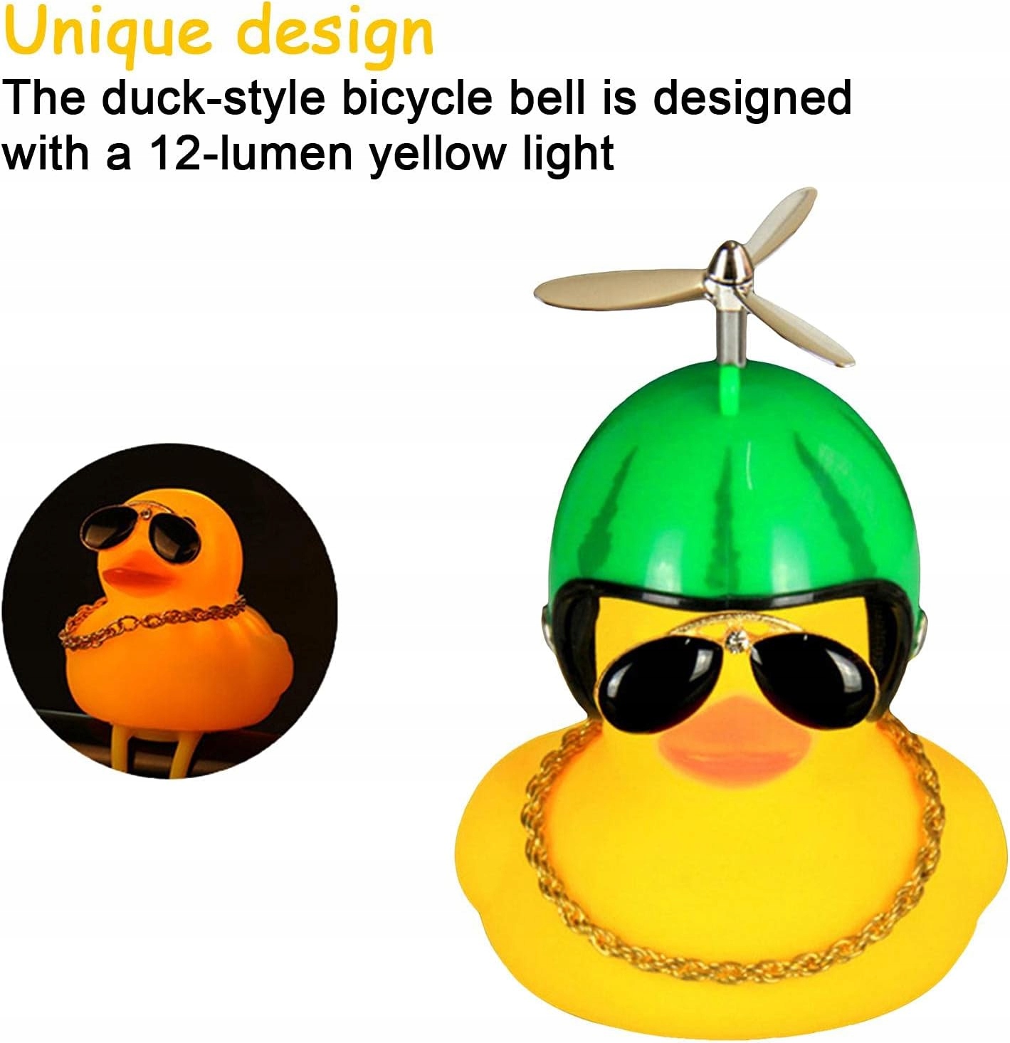 Невелика жовта качка з гвинтом на шоломі є повітряні нігті, які швидко обертаються під час руху. Вам потрібен спеціальний та унікальний велосипедний дзвінок для вашого велосипеда. Унікальний дизайн велосипедного дзвінка в стилі качки був розроблений з жовтим світлом з 12 люменами і випромінює звук 45 децибелів. Натисніть або натисніть качку дзвоника і почніть плакати. Легка збірка спочатку витягніть нижній ремінь качки до велосипедної палички, а потім прикріпіть його з гачком у формі S, щоб установка було легко закінчити. Це можна зробити вручну без використання інструментів. Регульований гвинт може обертатися за допомогою вітру, шолом видаляється, а шолом можна зняти. Також качка без шолома дуже мила. Широкий спектр застосування качки для велосипедного дзвінка може використовуватися як велосипедний дзвіночок Його також можна використовувати як пейджер пацієнта або можна розмістити в інвалідному візку, натиснувши качку для освітлення, щоб нагадати іншим. Він також може бути використаний як іграшка для дітей, і ви обов'язково знайдете більше функцій, які чекають на відкриття.