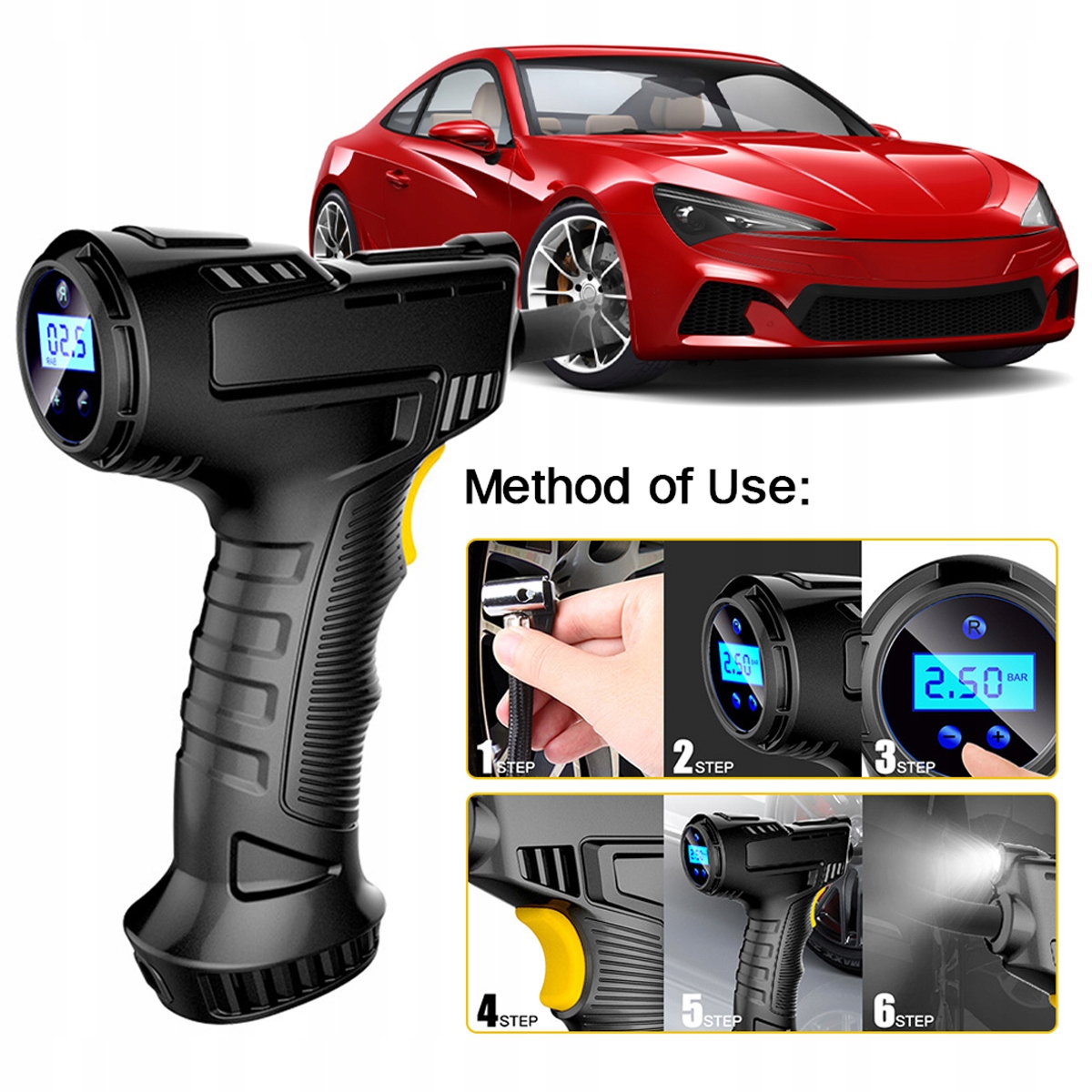 - ✅ Точне накачування: бездротовий компресорний насос забезпечує точне накачування велосипедних і автомобільних шин. Ви можете вибрати правильний тиск для своїх шин, щоб забезпечити оптимальну продуктивність і безпеку водіння. Функція автоматичної зупинки при досягненні заданого тиску допоможе вам уникнути надмірного накачування шин.