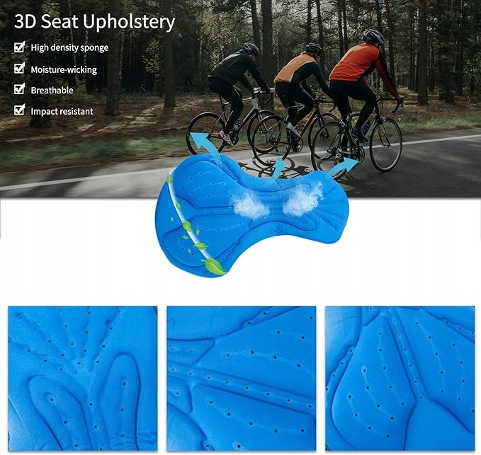 3D-подушка з високою гнучкістю. М'який край високоякісної губчастої подушки ефективно вирішує проблему внутрішнього тертя стегон, спричинену жорстким краєм традиційної подушки. Чоловічі велосипедні шорти мають цільний силікагель, який служить буфером під час їзди, а вентиляційний отвір із силікагелем забезпечує вентиляцію та захист шкіри. Чоловічий велосипедний трикотаж Надзвичайний ефект відведення вологи.