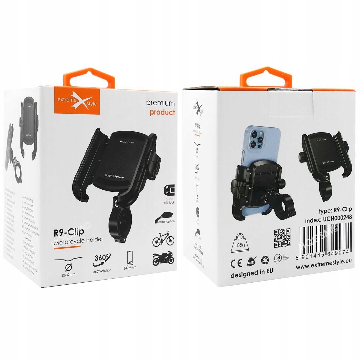 Тримач має два види кріплення - на кермо і під дзеркало. Металевий тримач керма прикручується шестигранним гвинтом, що гарантує надійне утримання. Завдяки додатковим шайбам тримач підходить для керма діаметром від 22 до 32 мм.