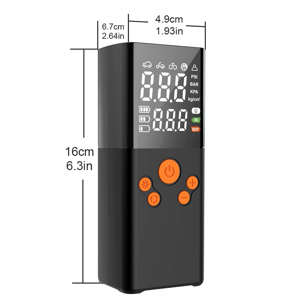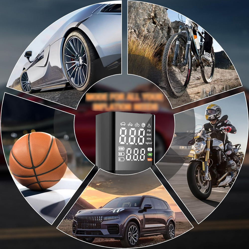 - він може одночасно відображати поточний тиск у шинах та заздалегідь встановлений тиск у шинах, що зручніше використовувати. Він має 4 одиниці тиску повітря: PSI, BAR, KPA та KG/CM², і може встановити режим насосів (велосипед/автомобіль/автомобіль/м'яч та режим пам'яті) для задоволення різних вимог.