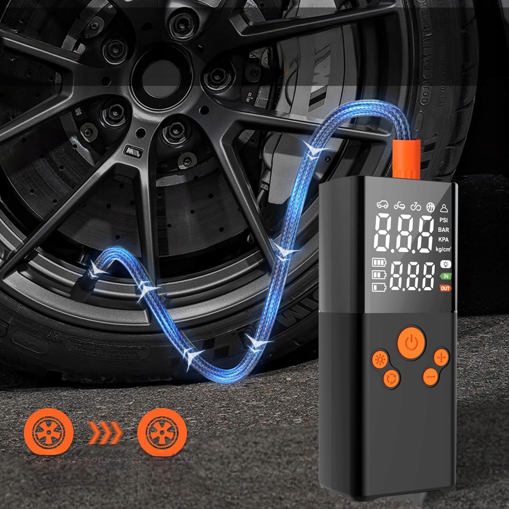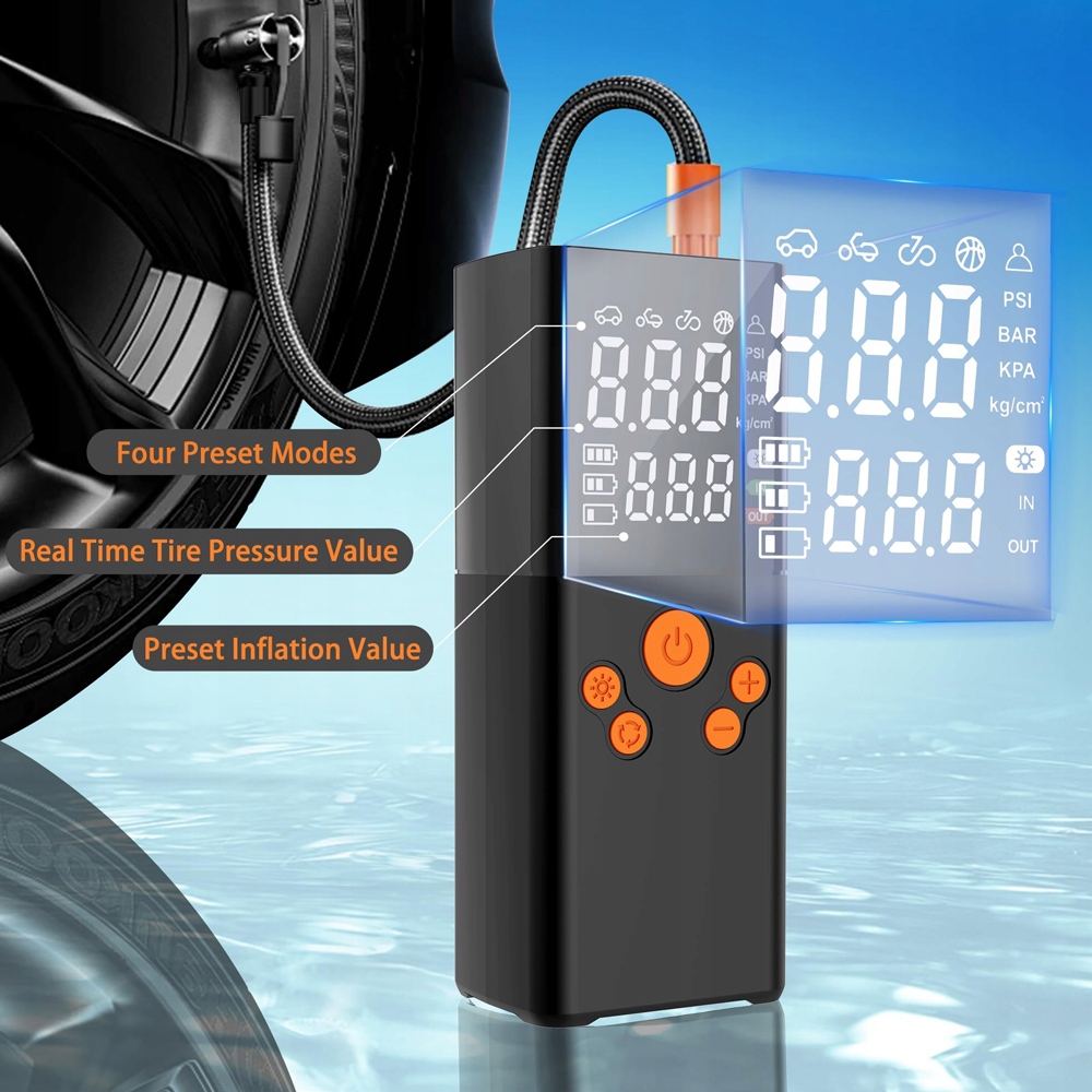 -оснащений функцією заздалегідь встановленого тиску в шинах, автоматично зупиняється після досягнення попередньо встановленого значення, допомагає уникнути надмірного перекачування та вивільняє руки. Максимальний тиск накачування становить 150 фунтів на дюйм/10 бар, а мінімальний тиск встановлюється на 3 фунт/кв.дюйм.