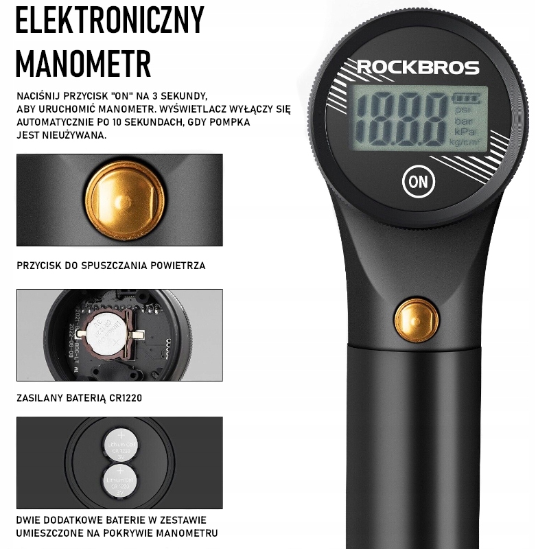 Насос має електронний манометр тиску, , який полегшує читання та дозволяє відображати значення у чотирьох різних одиницях - PSI, BAR, KPA та KG/CM2. Кнопка розміщується під дисплеєм, що дозволяє легко регулювати тиск повітря.