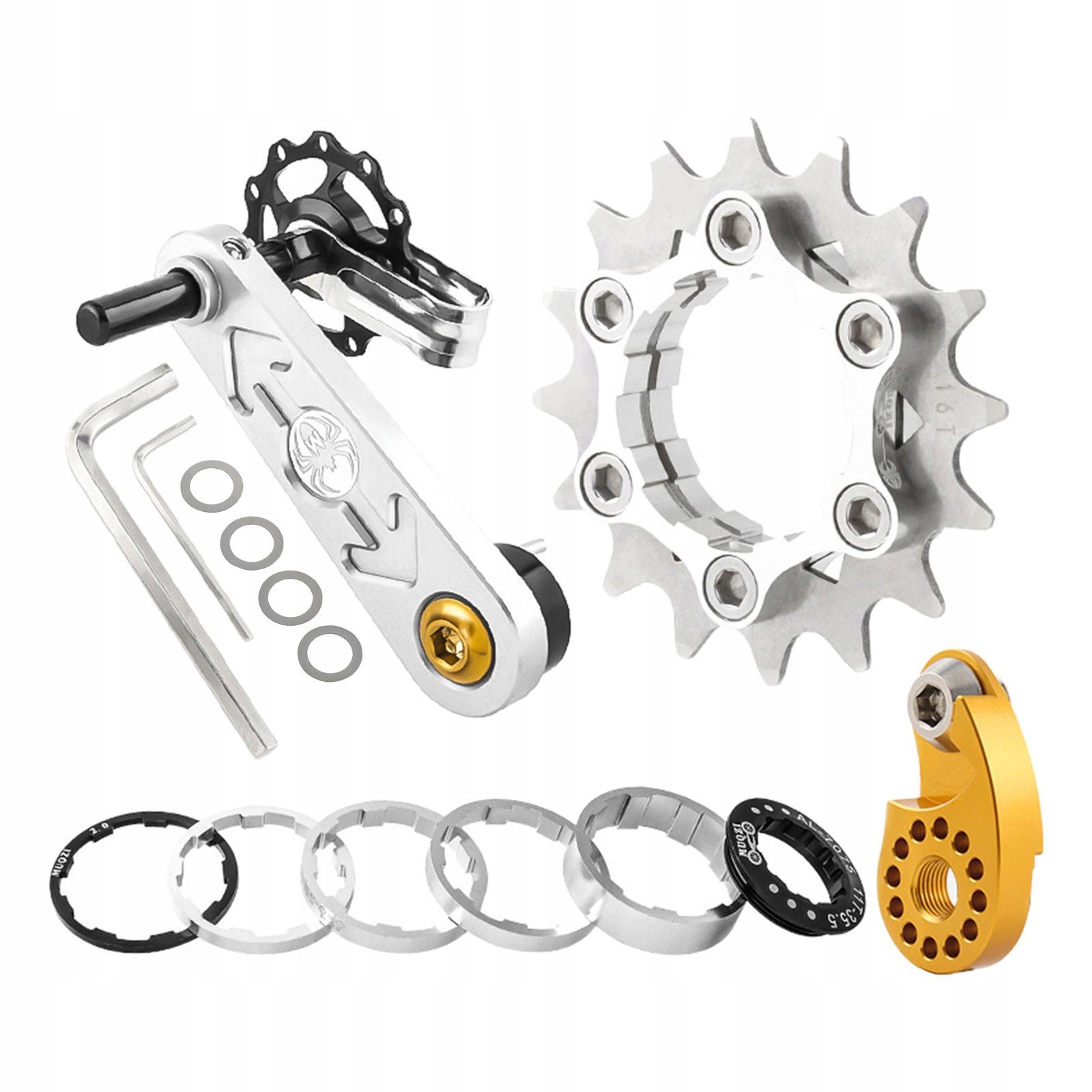 [Пакет містить]: 1 натягувач ланцюга, 5 одношвидкісних прокладок із прокладками, 2 гайкові ключі з прокладками, 1 одношвидкісна касета та 1 регулятор.