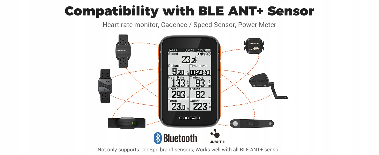 ✅Підтримка HR/Cad/Spe/Power Analysis - велокомп’ютер BC200 GPS може підключатися до кількох датчиків через ANT і Bluetooth, як-от монітор серцевого ритму, датчик швидкості та частоти педалей, вимірювач потужності.