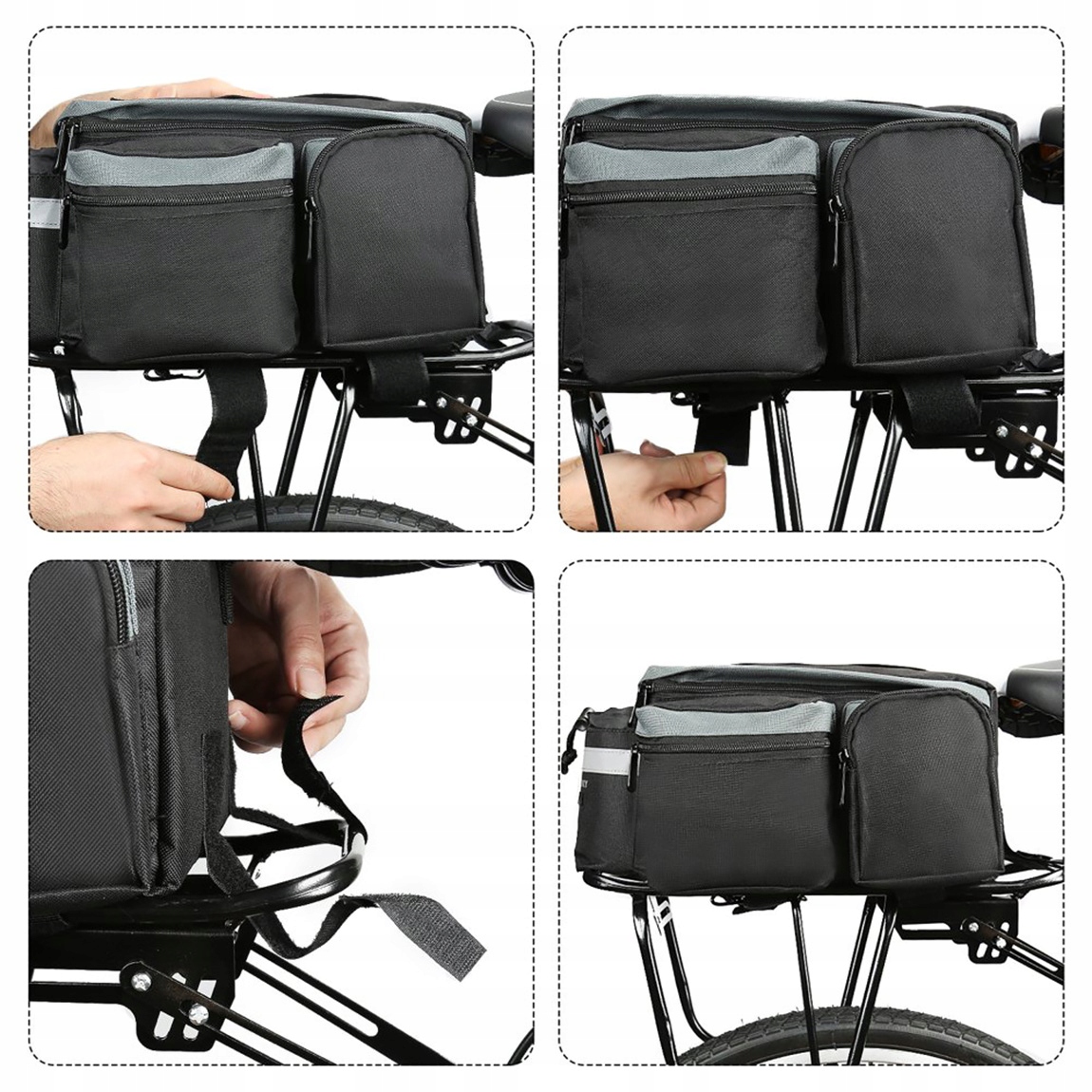 Компактна велосипедна сумка від Wozinsky — аксесуар, який варто брати з собою в кожну велосипедну подорож. Виготовлений з якісного водонепроникного матеріалу (поліестер), легко монтується на багажник наших двох коліс (за допомогою 4-х ременів на липучках). Хоча при необхідності ніщо не заважає носити сумку на плечі (в комплекті є регульований ремінь) або носити в руці, тримаючись за ручку, розташовану на клапані.