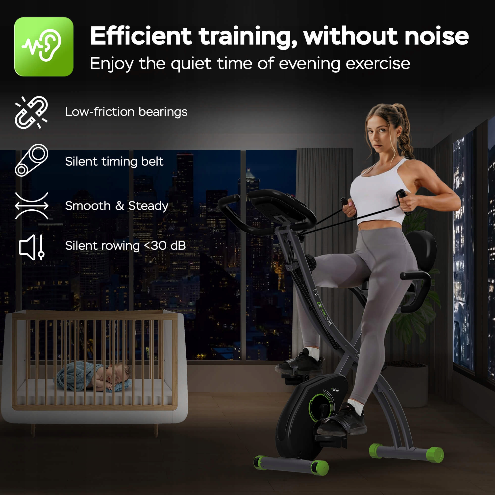 Ви хочете тренуватися пізно ввечері чи рано вранці, коли решта домочадців ще спить? немає проблем! Цей велосипед розроблено для максимальної обережності.
