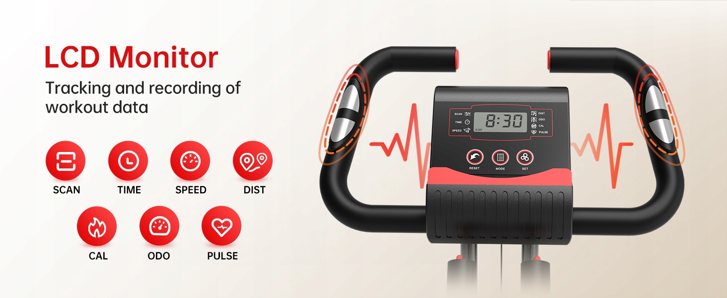 Будьте в курсі свого прогресу за допомогою РК-монітора, який зручно відстежує такі основні параметри, як час, швидкість, відстань, спалені калорії та частота серцевих скорочень. Цей багатофункціональний дисплей дозволяє ефективно контролювати тренування під час використання цього кардіотренажера. Крім того, вбудований тримач для телефону покращує комфорт тренувань, дозволяючи вам насолоджуватися розвагами під час обертання педалей для досягнення ваших цілей у фітнесі.