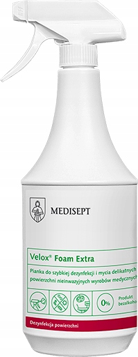Рідина Velox Foam Extra призначена для дезінфекції поверхонь неінвазивних медичних виробів, чутливих до спирту. Рекомендується для скла, порцеляни, металу, гуми, пластику та акрилового скла. Його можна використовувати у відділеннях інтенсивної терапії та операційній для дезінфекції медичного обладнання, реабілітаційного обладнання, лікувальних крісел, інкубаторів, лікувальних ламп і ультразвукових головок. Не містить спирту, альдегідів і фосфатів, тому не знебарвлює продезінфіковані поверхні. Завдяки інноваційній формулі, заснованій на синергії поверхнево-активних речовин і технології наноміцел, продукт має широкий спектр знищення та унікальні миючі властивості. Має приємний запах. Товар має позитивний відгук від виробника медичного обладнання Famed щодо стійкості матеріалу до АБС-пластику та оббивних матеріалів.
