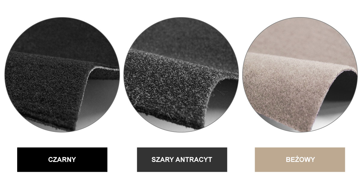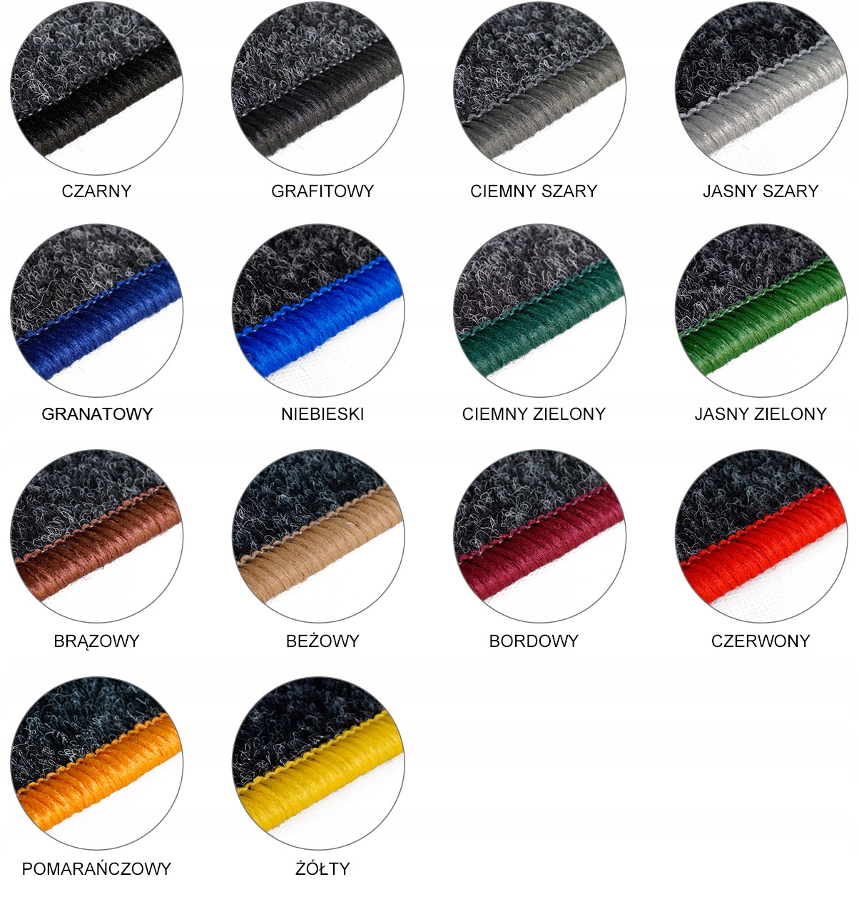 Нижче ми представляємо набір велюрових килимків. у варіанті "СТАНДАРТ" щільністю 1750 г/м2, товщиною близько 0,5 см, обробленої міцною і довговічною пряжею 14 кольорів на вибір. Килимки ретельно розроблені та виготовлені LASOTA, адаптовані до форми підлоги вашого автомобіля, згаданої вище. Низ килимків покритий шаром грубої гуми, щоб вони не намокали і не зміщувалися. На водійський килимок пришито посилення, щоб подовжити термін служби килимка.