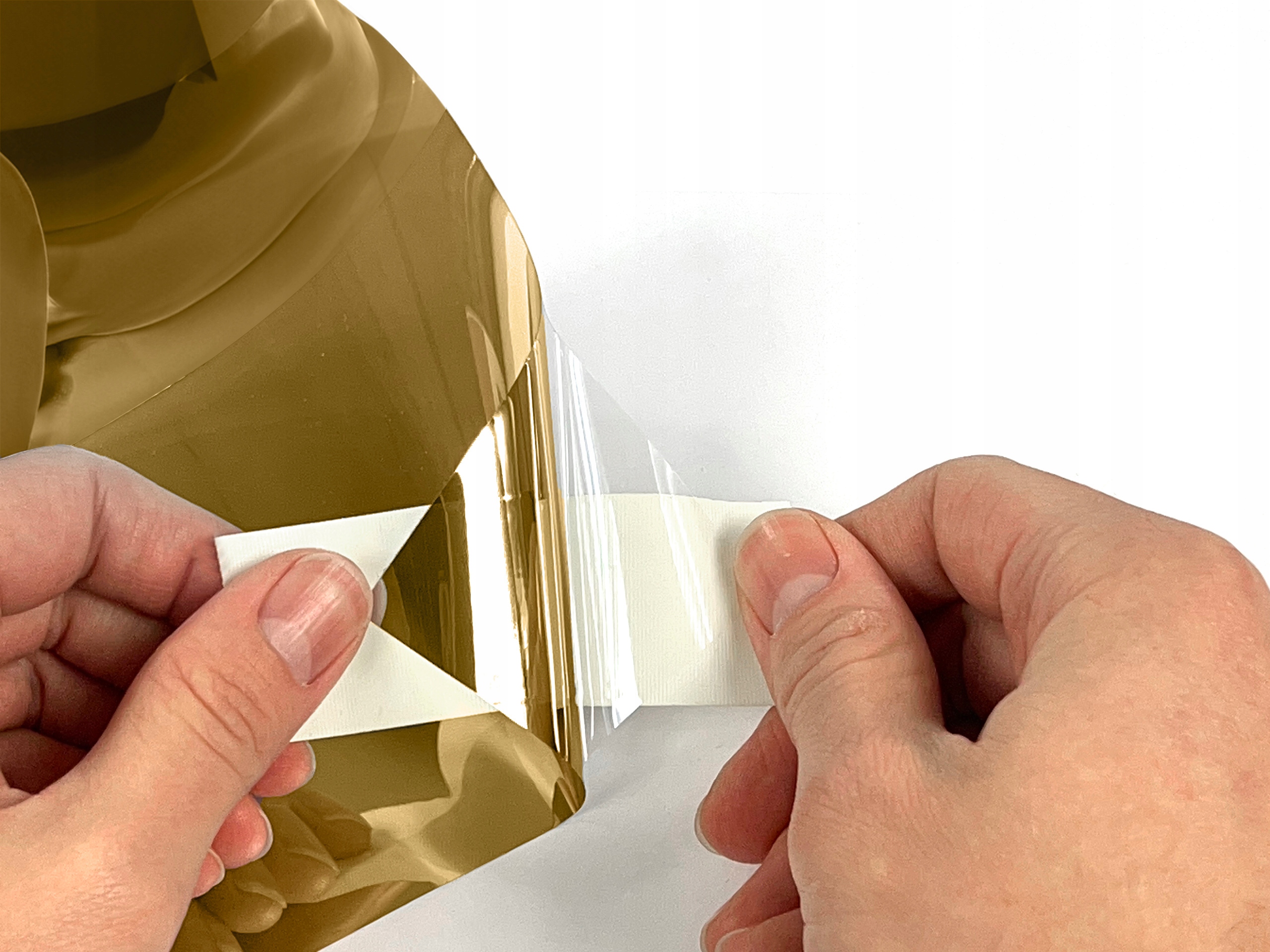 Для того, щоб легко знайти, з якої сторони є прозора захисна плівка, достатньо приклеїти на край фольги з обох боків на шматочку клейкої стрічки, а потім обережно розтягується.