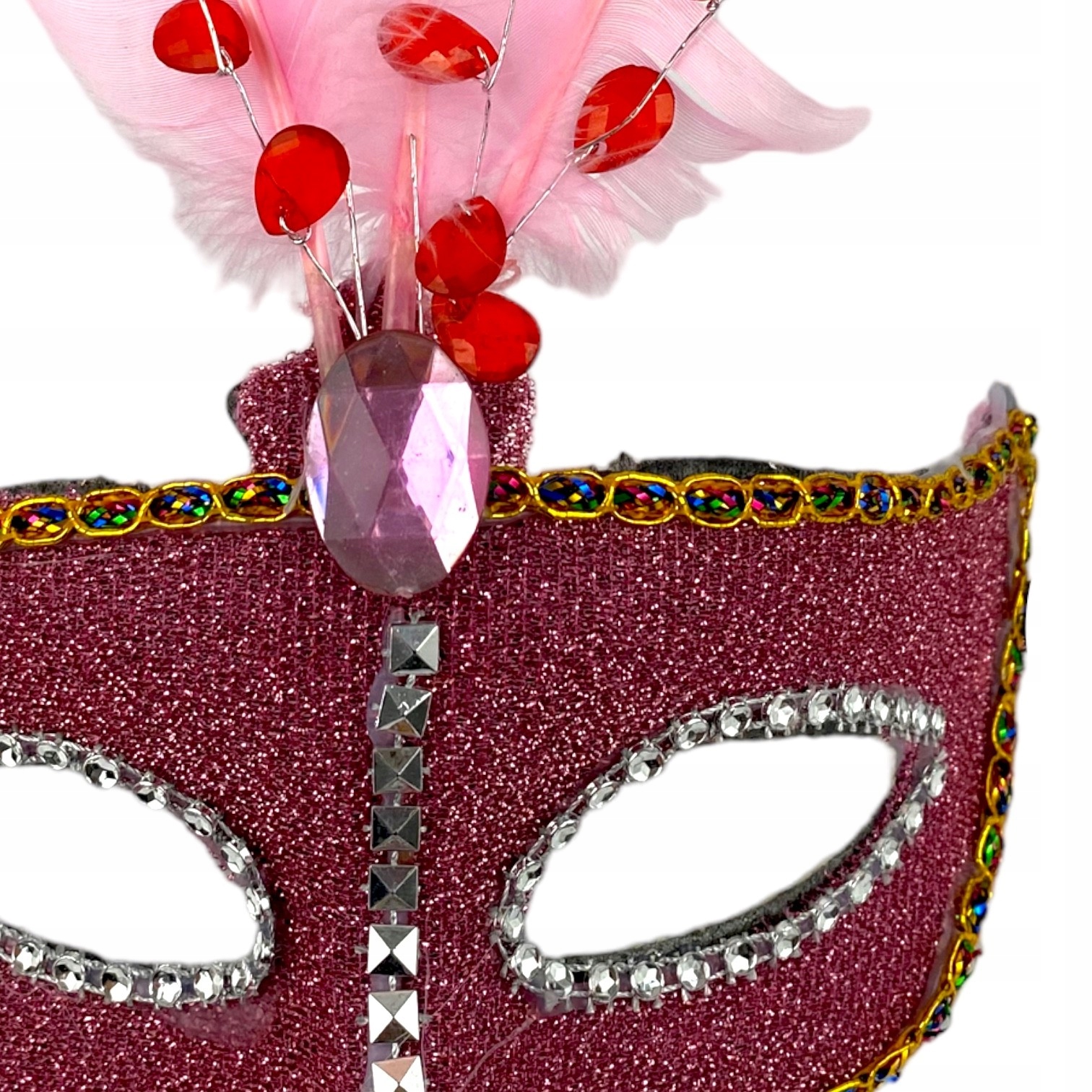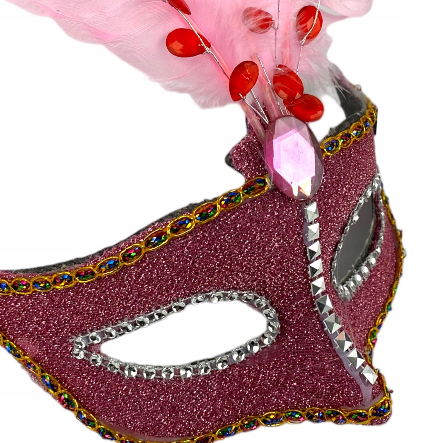 Красиво прикрашений блискучим матеріалом і пір'ям. Гліттерні прикраси та блискітки додають масці елегантності та загадковості. Зав'язується на потилиці стрічками.