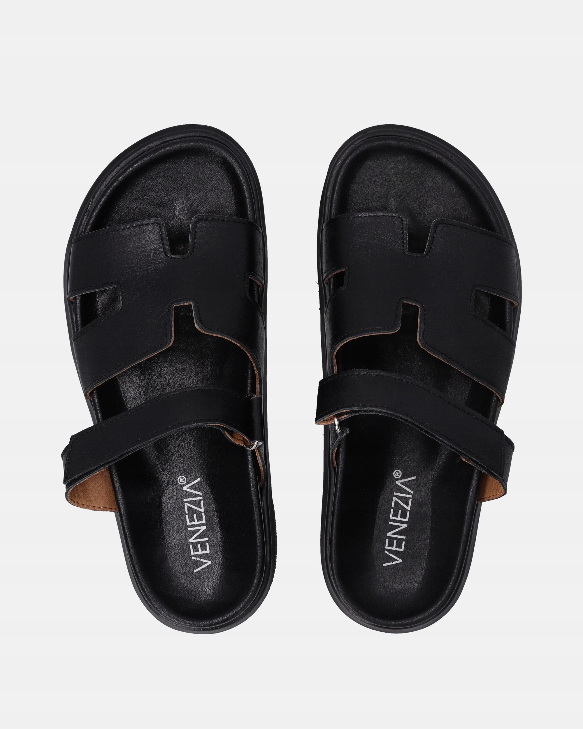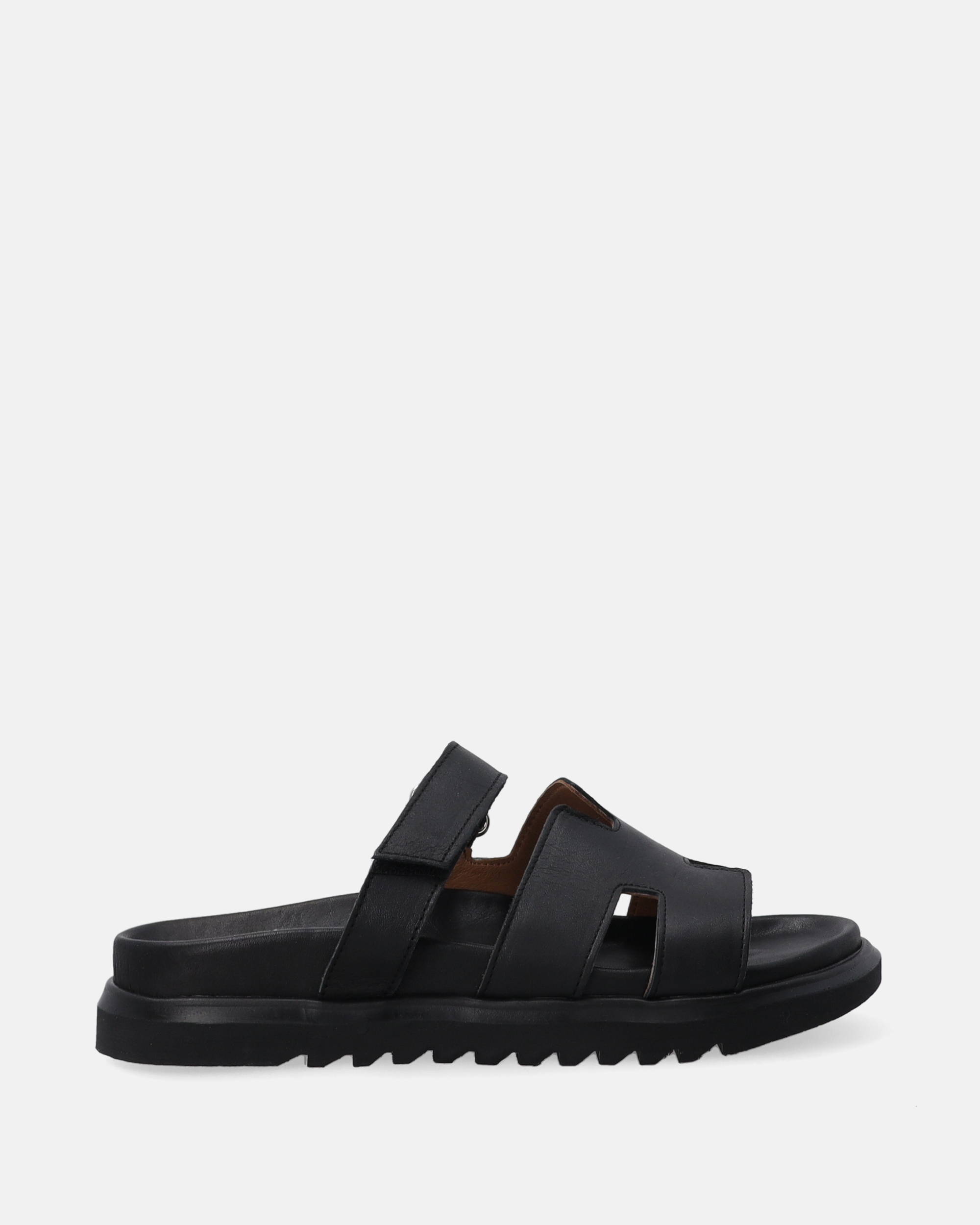 Жіночі тапочки, виготовлені з натуральної шкіри в чорному відтінку. Три Широкі смуги, включаючи одну з липучкою, забезпечують зручну форму. Контрастна, чорна підошва з чітким протектором додає сучасну характер.