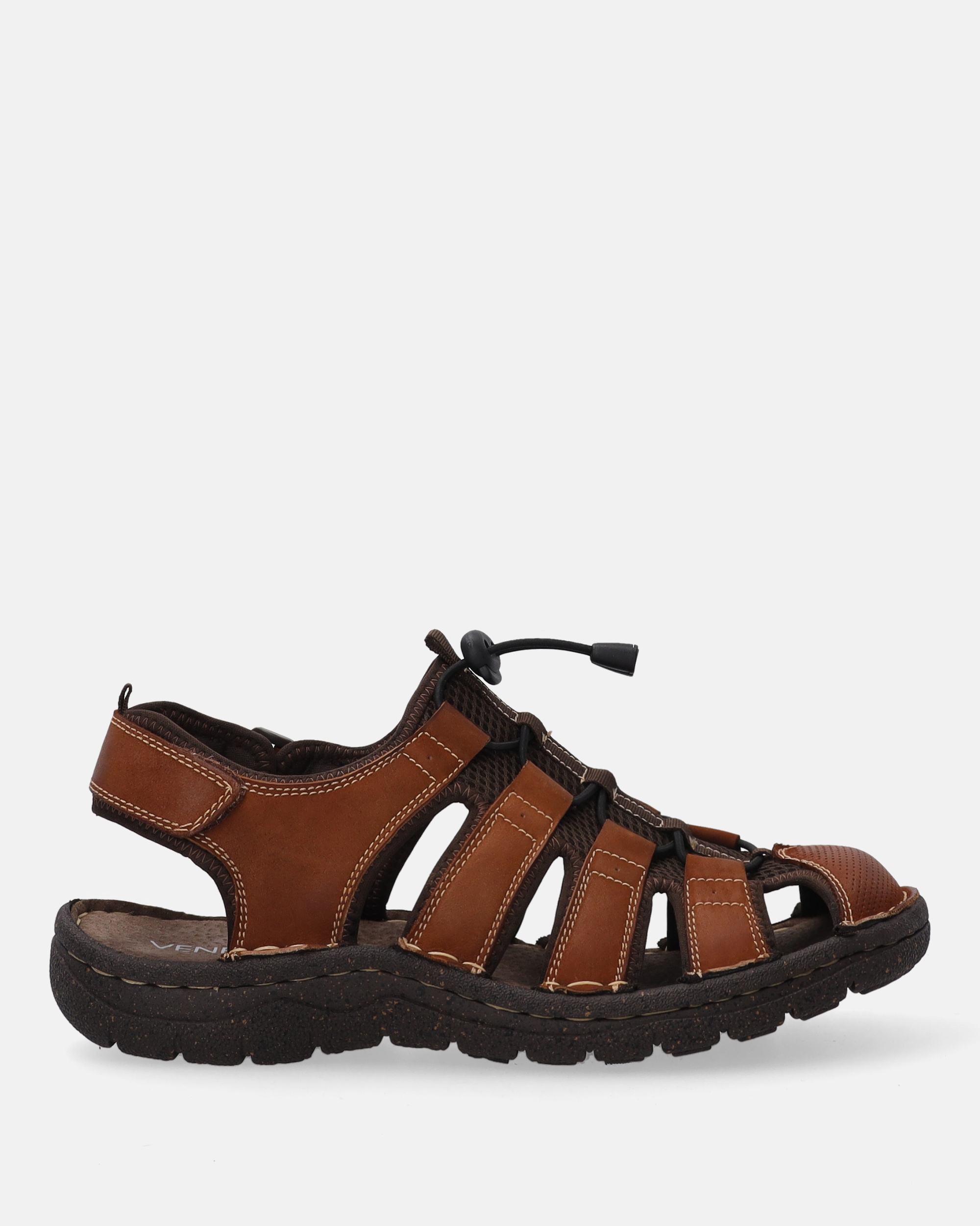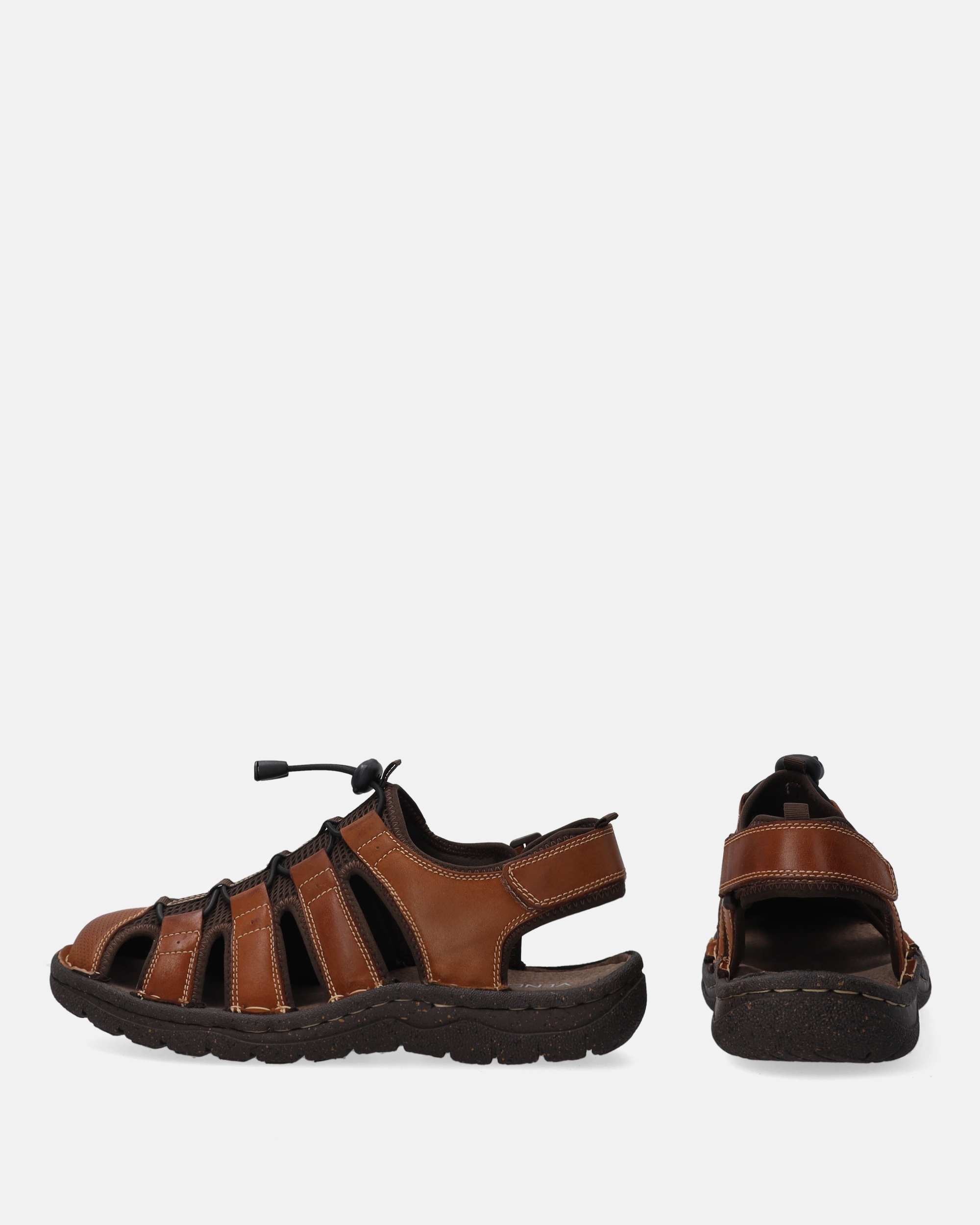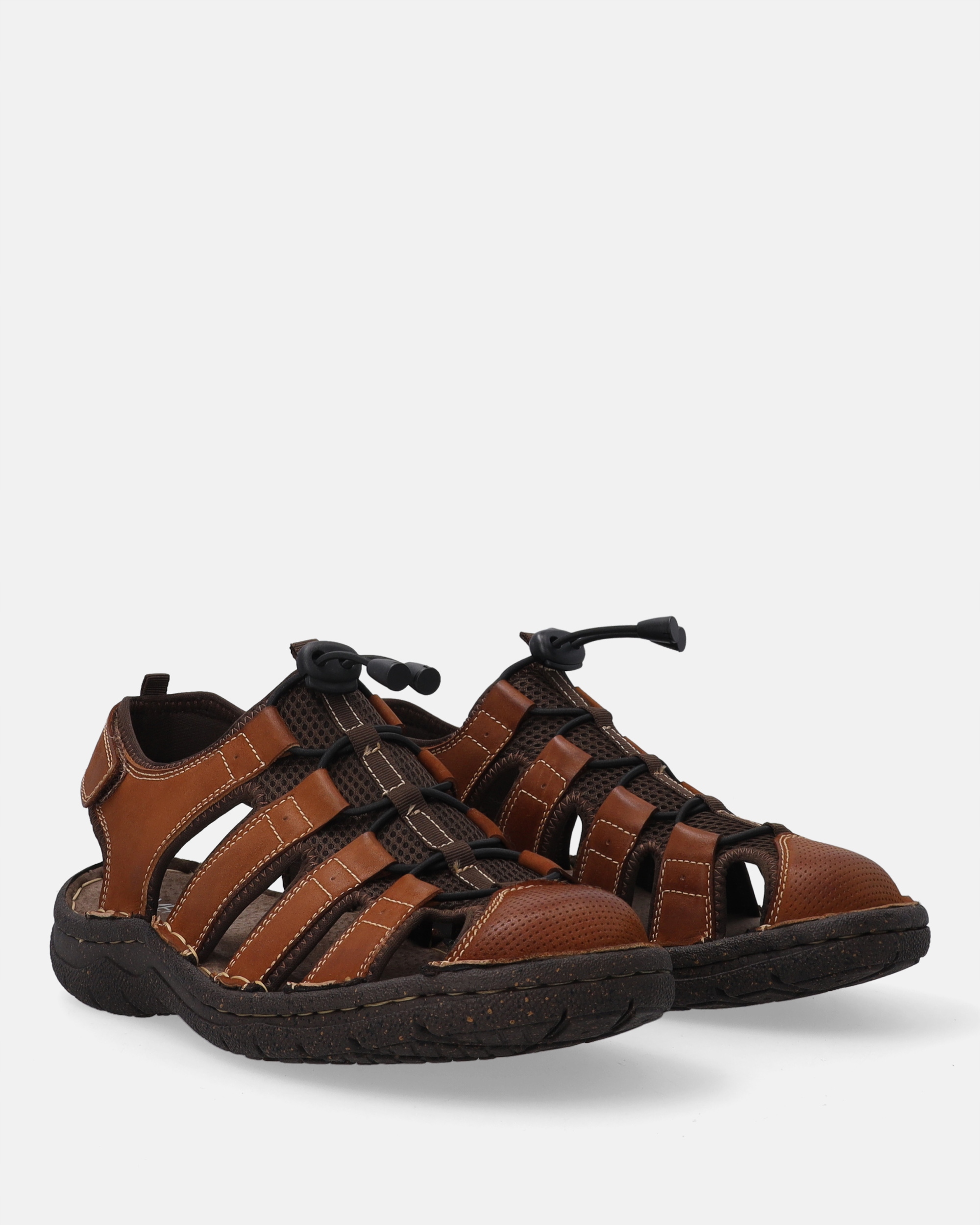 коричневі чоловічі босоніжки, виготовлені з натуральної шкіри з матеріальним покриттям. Гнучкі шнурування з секундором та липучкою на підборах полегшують пристосування. Верхній з контрастним зшиванням та перфорованою панеллю на передній частині підкреслює випадковий характер моделі. М'яка вставка та гнучка комфорт підтримки підошви щодня.