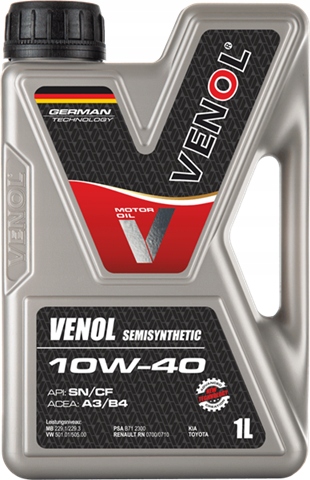 Venol Semisynthetic SN/CF 10W-40 — напівсинтетичне моторне масло, призначене для експлуатації в складних умовах експлуатації. Розроблено на основі високоякісних мінеральних і синтетичних основ і останнього покоління збагачувальних добавок. Забезпечує ефективний захист двигуна від зносу, зберігає його в чистоті і гарантує ідеальне змащення з моменту запуску.