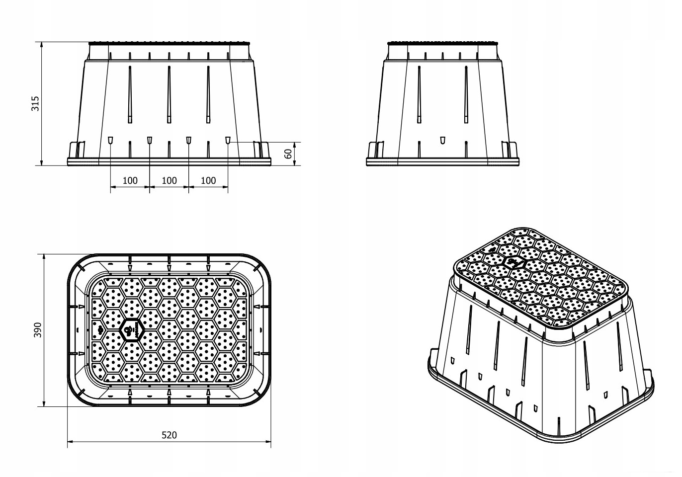Вентильний колодязь СТАНДАРТ являє собою прямокутну коробку без дна, з кришкою, що загвинчується. Колодязь забезпечує легкий доступ до електричних або ручних клапанів, які використовуються в системах автоматичного поливу. Клапанні свердловини надійно захищають клапани від пошкоджень. Він призначений для використання у великих садових спорудах і громадських місцях. Вентильний колодязь СТАНДАРТ дозволяє розмістити всередині до 4 вентилів. Кришка люка виготовлена з пластику (поліетилен PEHD), стійкого до погодних умов та УФ-випромінювання. Корпус колодязя виготовлений з матеріалу (поліетилен PEHD), стійкого до механічних пошкоджень. Доступ до внутрішньої частини камери забезпечується гвинтом INOX. Колодязь доступний з чотирма кольорами кришки: зелений (HIDE) - для схованки в траві чи інших зелених зонах, помаранчевий (FIND) - легко знайти, коричневий (WOOD) - для схованки в корі, сірий (STONE) - для схованки в камінь /бруківка.