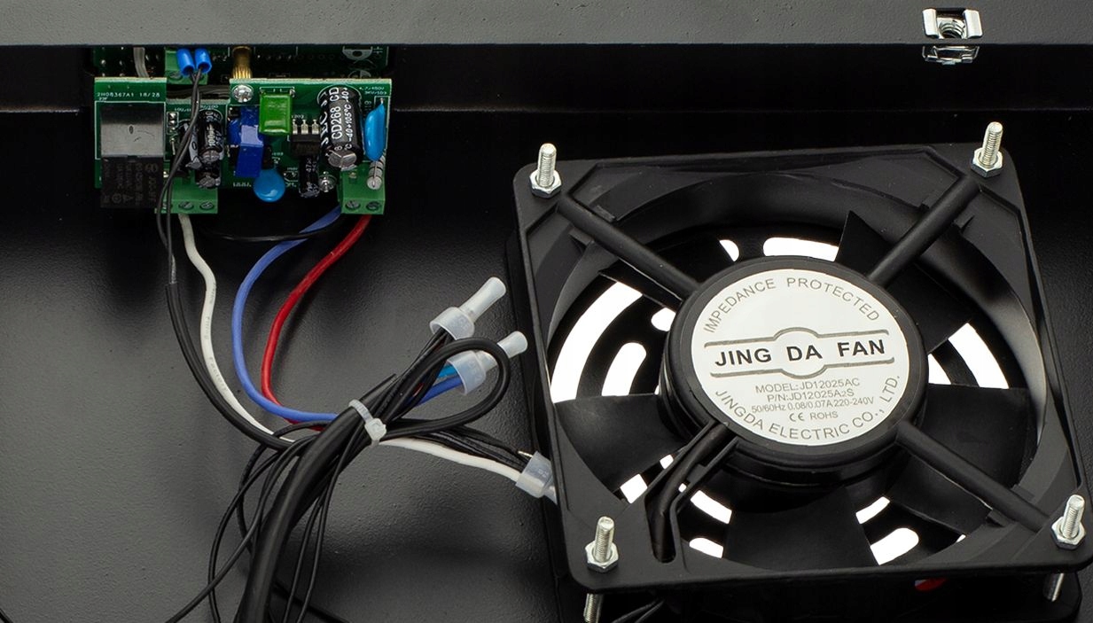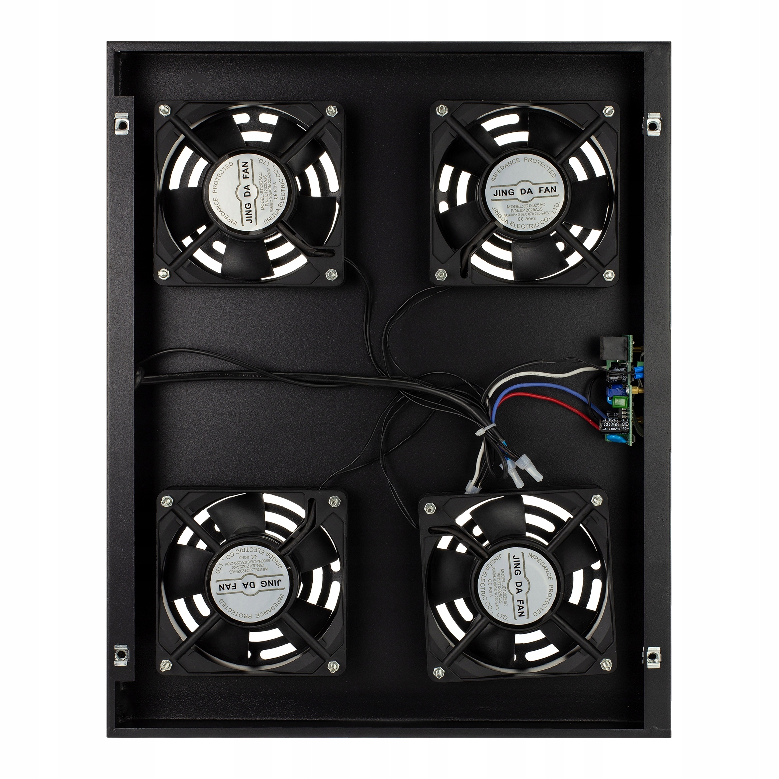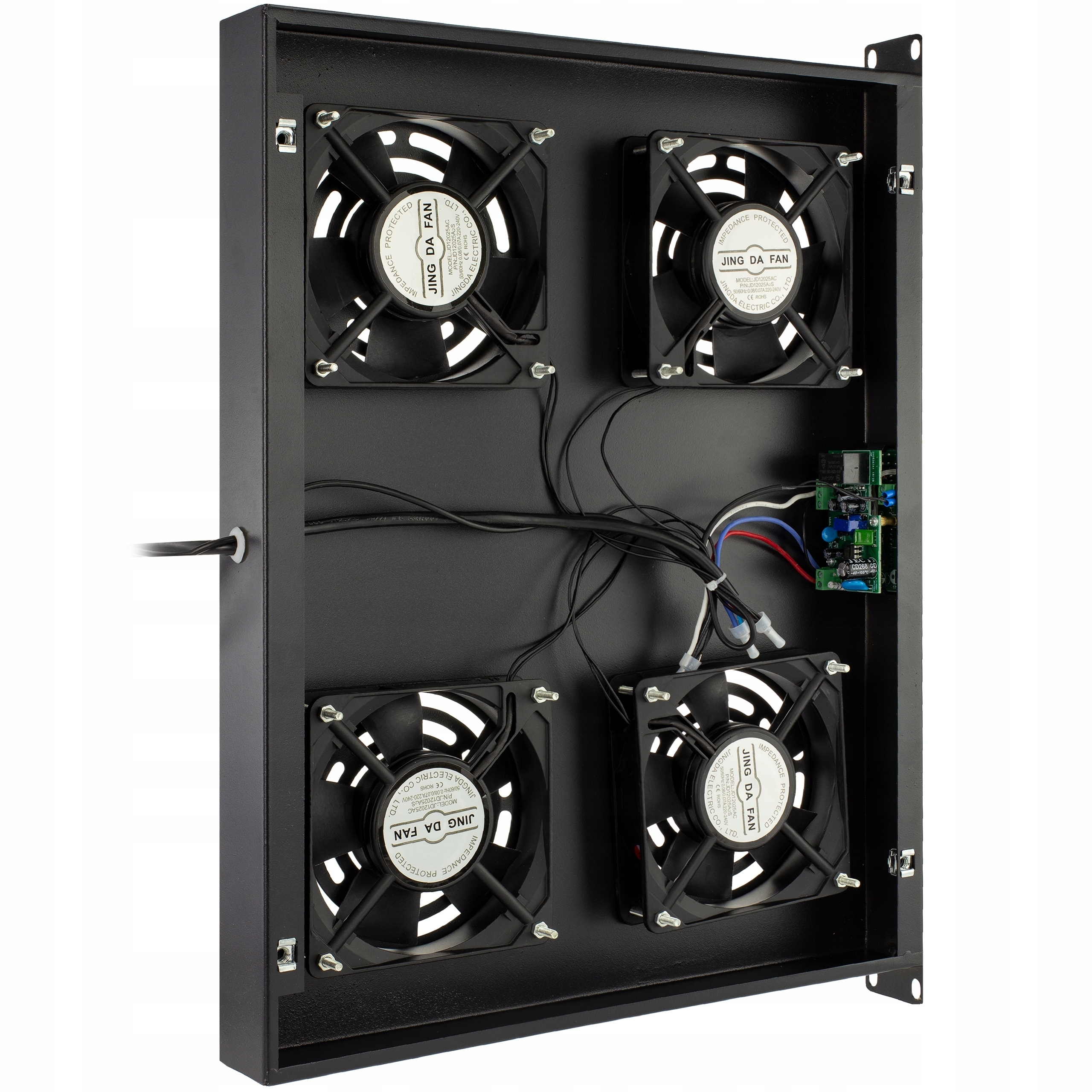 Ефективна вентиляційна панель для підвісних і стоячих стандартних шаф 19" RACK. Чотири вентилятори з вбудованим термостатомдля плавного регулювання та цифровим індикатором для вимірювання поточної температури.