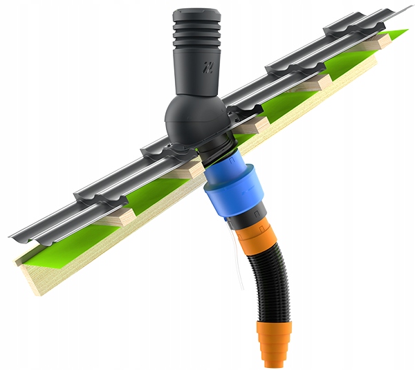 - Витяжна труба - елемент з'єднання системи, завжди розташований перпендикулярно схилу даху. Забезпечує легкий монтаж з’єднувальної труби.