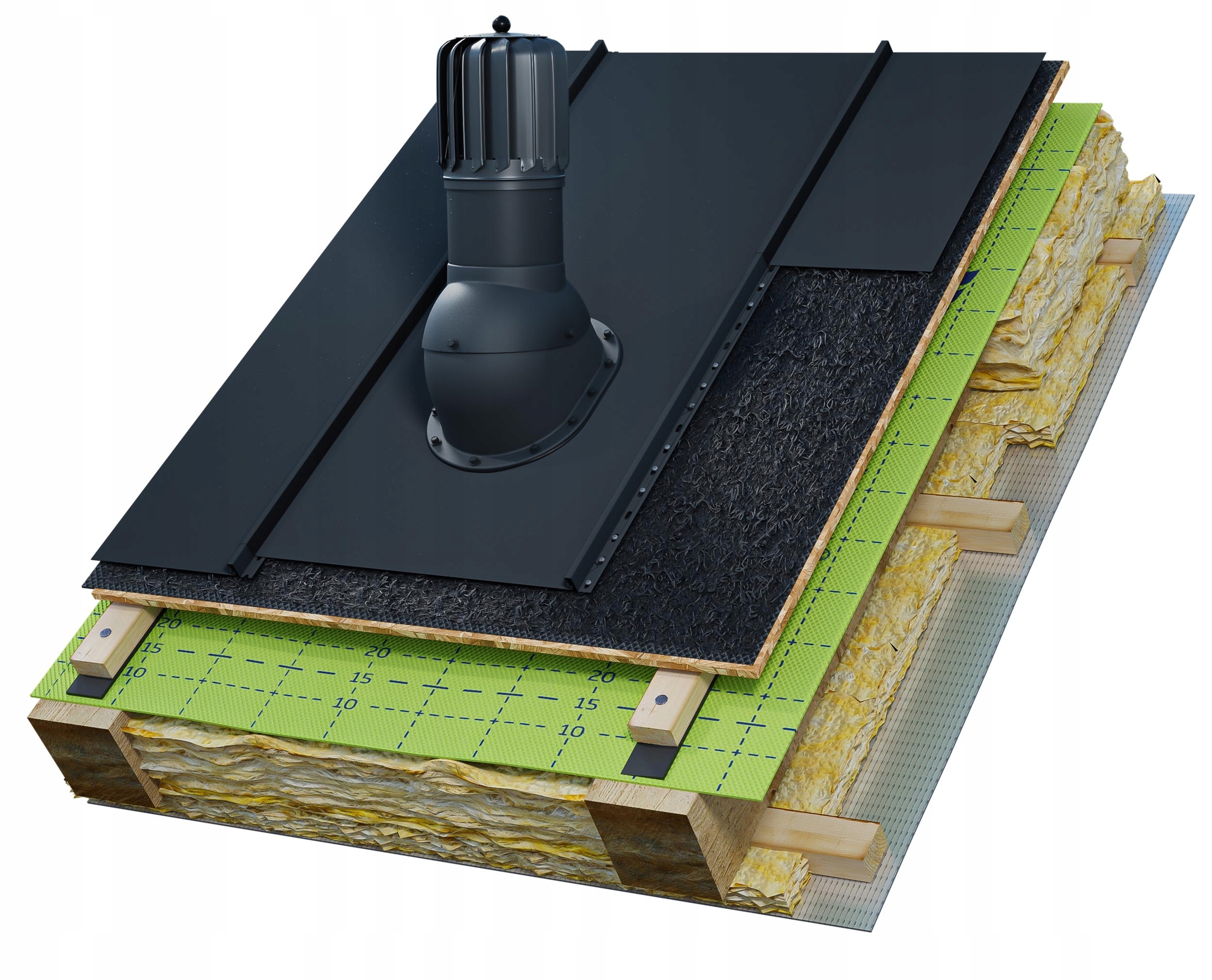 Даховий камін Eurovent® VENTOS X ROTO BITU O використовується як даховий вивід для вентиляційних каналів самопливу в житлових і громадських будівлях. Камін відповідає стандарту PN-83/B-03430 з поправкою /Az3. Основа каміна пристосована для встановлення на плоских покрівлях, включаючи бітумну черепицю, плоскі листи та фальцеві панелі даху. Регульований кут нахилу від 5° до 45°.