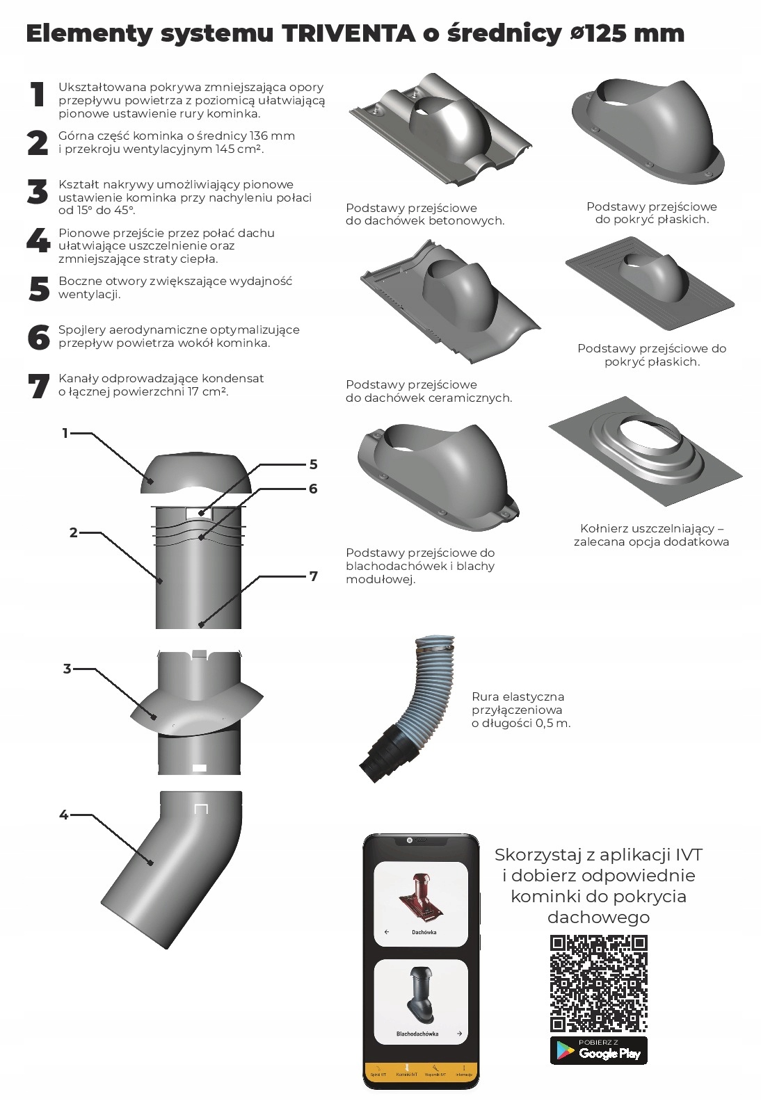 Конструкція системи дозволяє вертикально розташувати вентиляційний димохід в діапазоні нахилу даху від 15° до 45°. Верхня частина вентиляційного димоходу має канали для відводу конденсату.