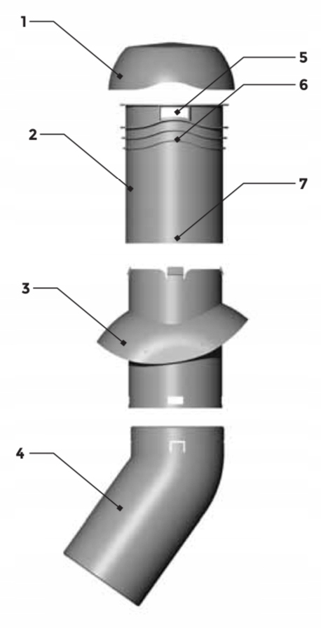 Конструкція системи дозволяє вертикально розташувати вентиляційний димохід в діапазоні нахилу даху від 15° до 45°. Верхня частина вентиляційного димоходу має канали для відводу конденсату.