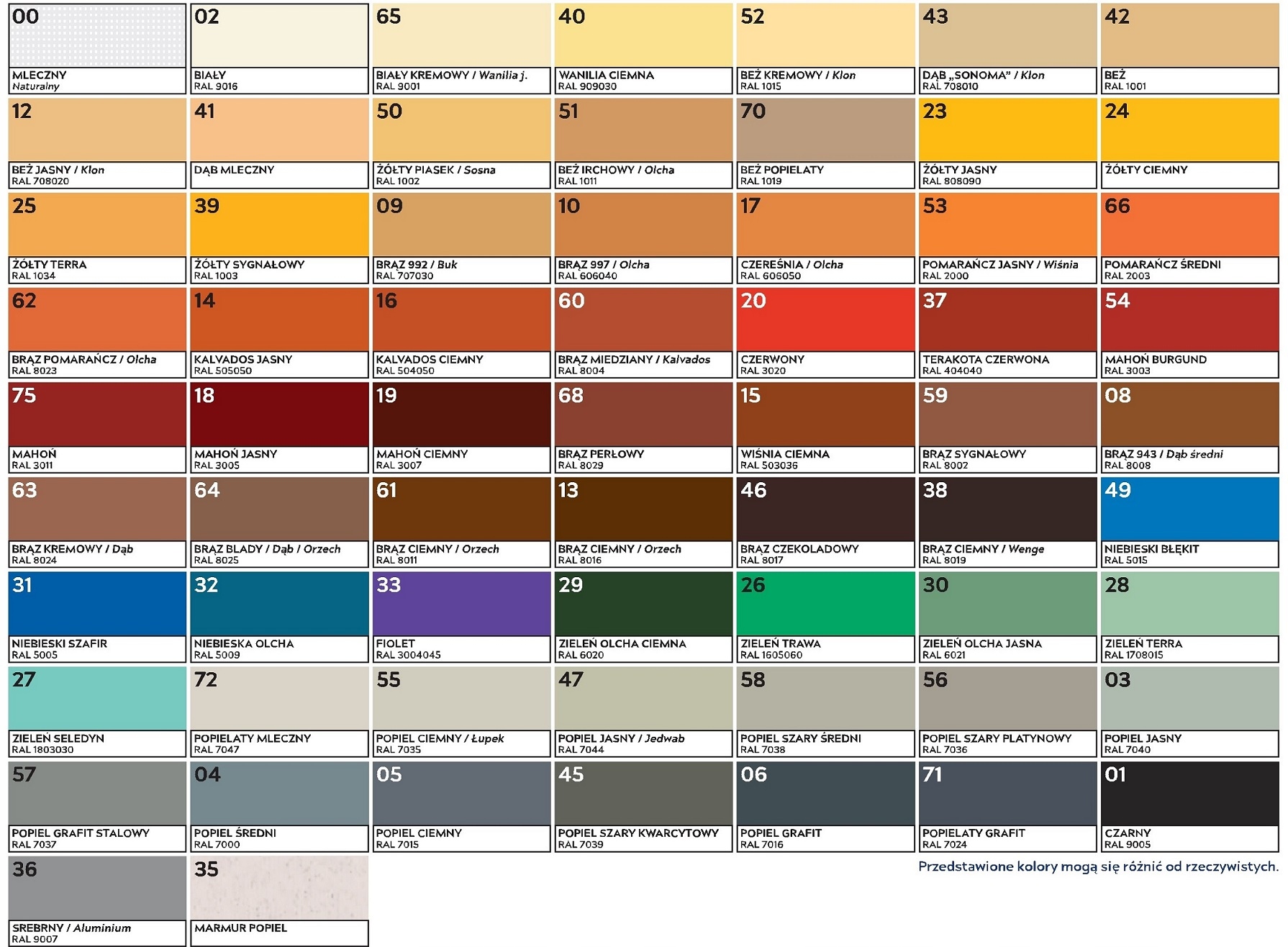 - можливість замовити будь-який колір з палітри RAL, якщо він не є стандартним на нашому складі, вартість продукту включає комісію за впровадження кольору - від 250 злотих нетто