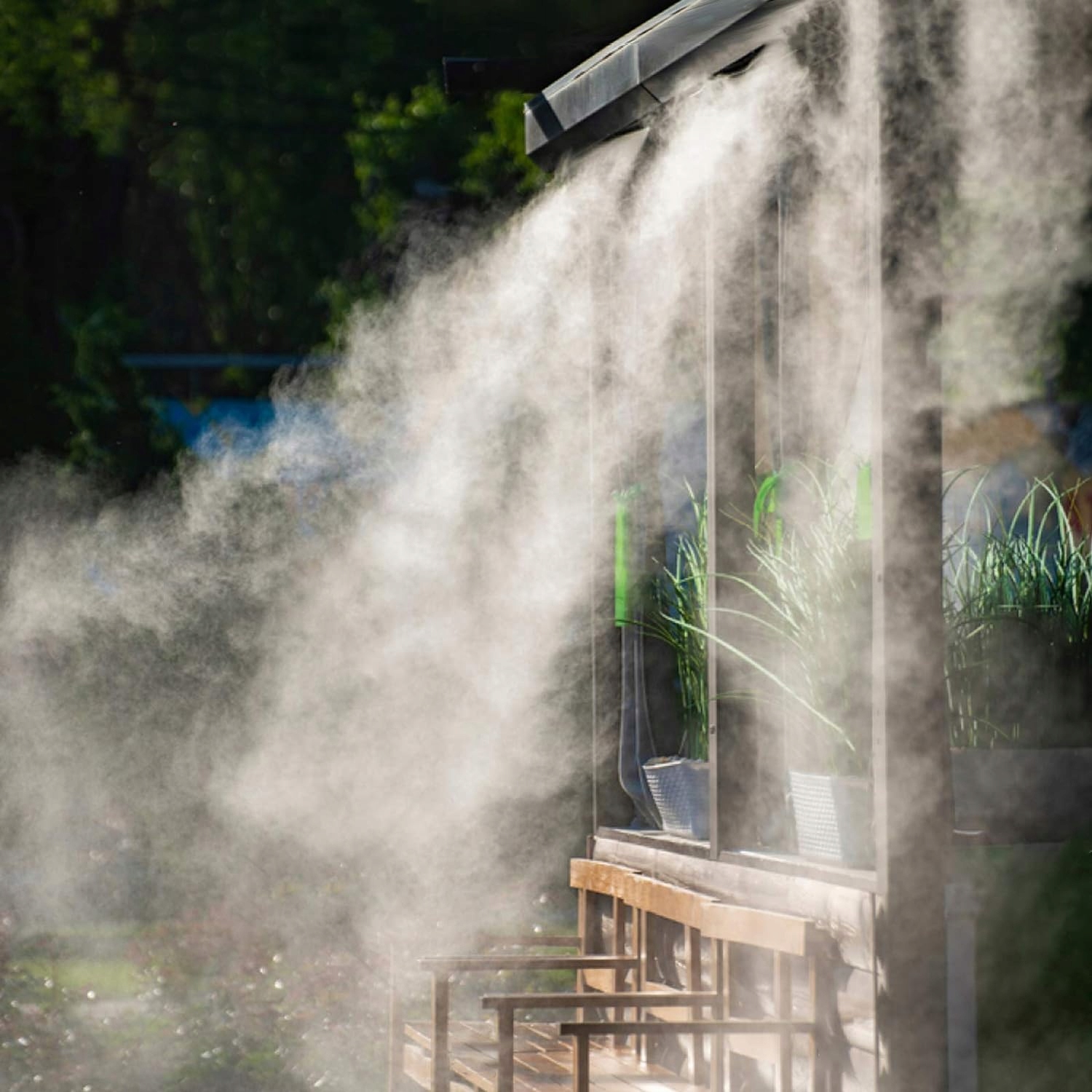 - Система водяного туману розпилює тонкий охолоджуючий водяний туман, який поглинає тепло з навколишнього середовища та зберігає прохолоду в спекотні літні дні.