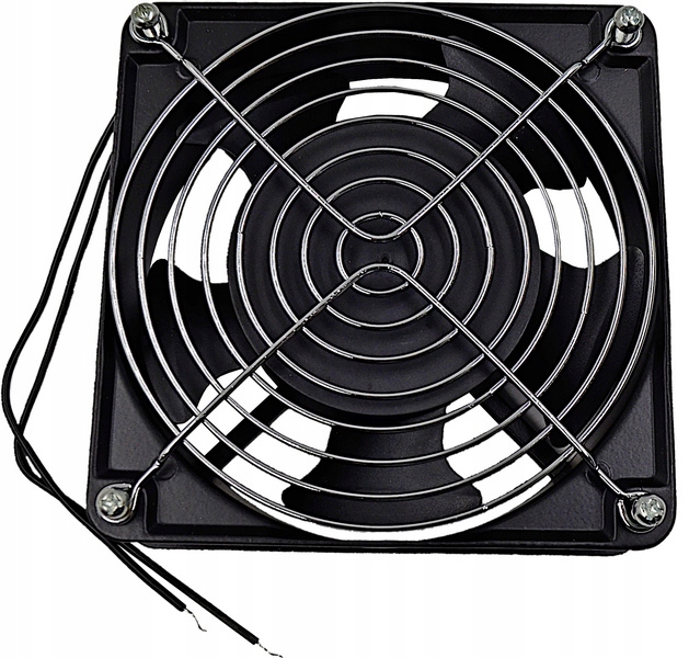 Вентилятор призначений для установки в даху підвісних 19" стойкових шаф. Розміри: 120x120x38 мм. Чотирьохточкове кріплення. Чорний колір.
