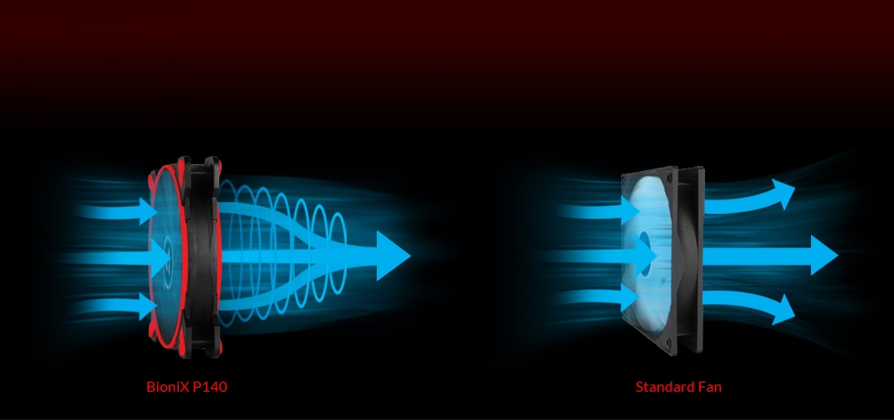 Під час розробки нового BioniX P140 особлива увага приділялася концентрованому потоку повітря, а отже, високому статичному тиску. Вентилятор гарантує винятково ефективне охолодження навіть при підвищеному опорі повітря. Тому BioniX P140 особливо підходить для використання на радіаторах і радіаторах.
