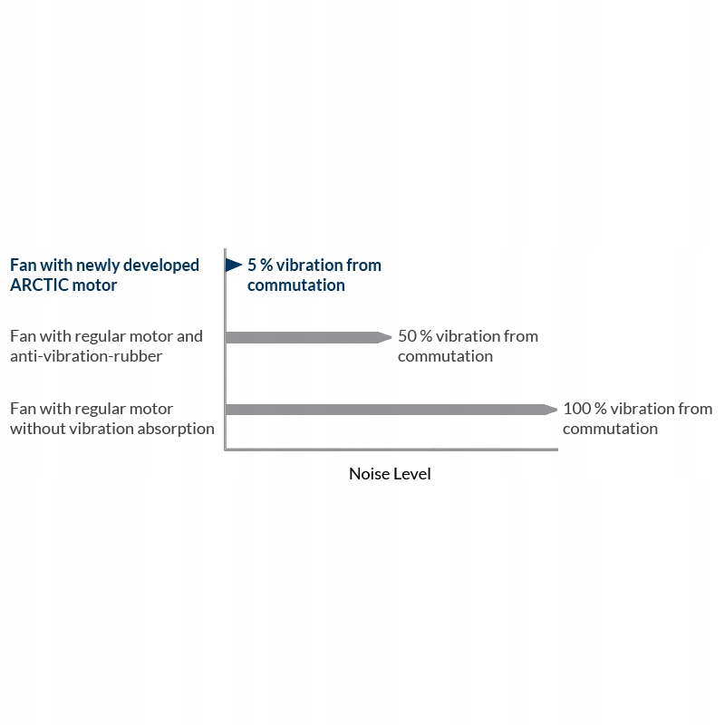 Навіть на низьких швидкостях звук нового двигуна ARCTIC ледве чутний. Завдяки синусоїдному намагніченню новий двигун створює лише близько 5% комутаційних коливань звичайного нефільтрованого двигуна постійного струму. Отже, немає необхідності використовувати гумові прокладки завдяки постійному та плавному крутному моменту нового двигуна.