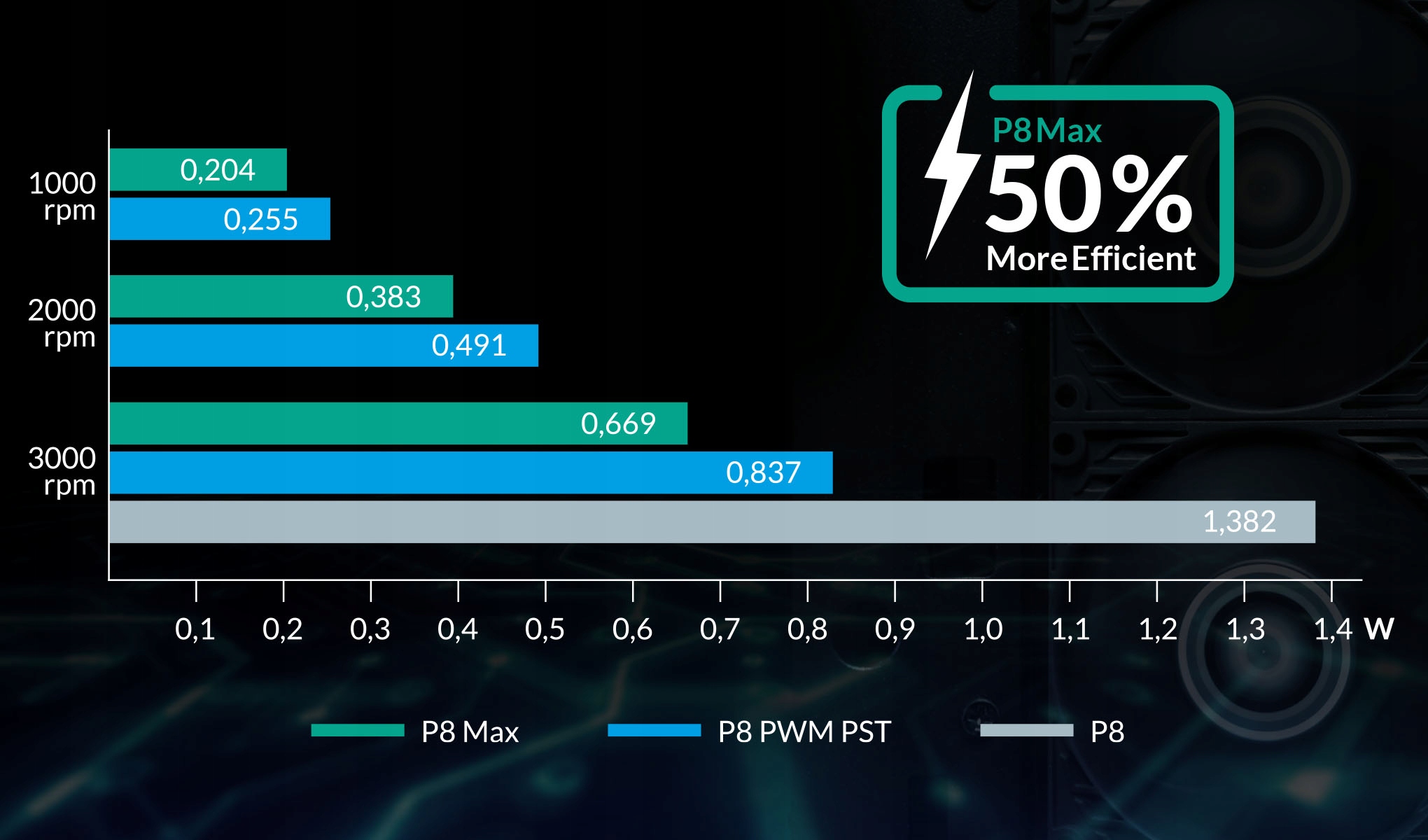 P8 Max відрізняється надзвичайно високою ефективністю. При швидкості 3000 об/хв і напрузі 12 вольт він потребує всього 0,669 ват, що відповідає струму 0,06 ампера.