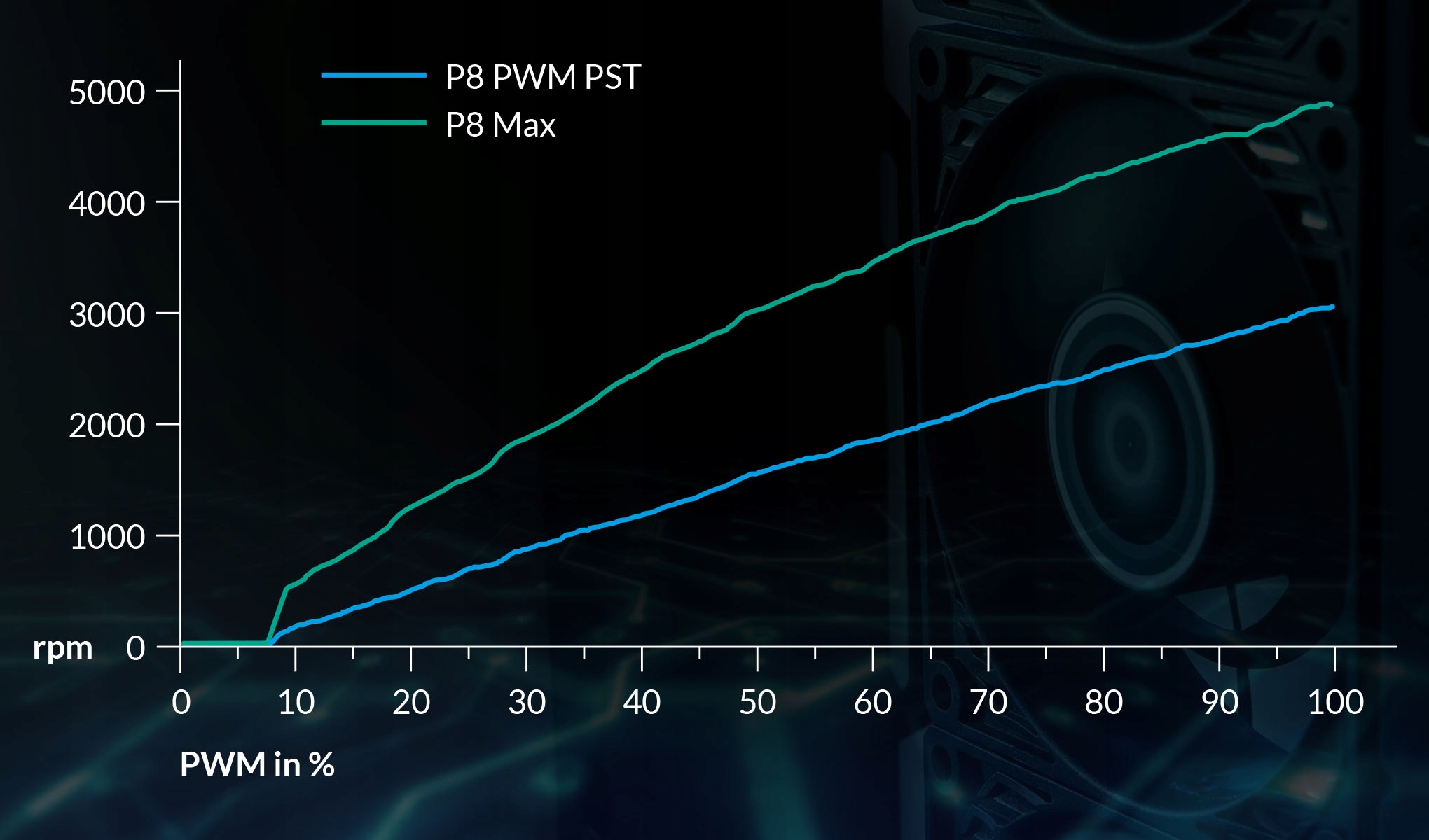 P8 Max забезпечує точну швидкість вентилятора (від 500 до 5000 об/хв) за допомогою керування широтно-імпульсною модуляцією, яке можна регулювати відповідно до індивідуальних вимог до охолодження. P8 Max забезпечує тиху роботу, коли потрібен лише низький потік повітря, і забезпечує високий рівень продуктивності, коли це необхідно.