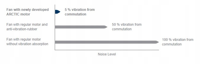 Навіть на низьких швидкостях звук нового двигуна ARCTIC ледве чутний. Завдяки синусоїдному намагніченню новий двигун створює лише близько 5% комутаційних коливань звичайного нефільтрованого двигуна постійного струму. Отже, немає необхідності використовувати гумові прокладки завдяки постійному та плавному крутному моменту нового двигуна.