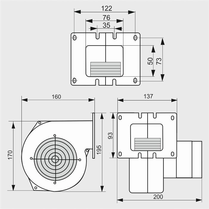 Вентилятор призначений для повітряного потоку для нагрівальних теплових печей. Він також може бути використаний для загальної вентиляції кімнат та технологічних пристроїв. Вентилятор складається з двох частин корпусу алюмінію, в якому встановлений двигун із зовнішнім ротором. Вхідний отвір закріплений сіткою. Отвір для виходу закінчується коміром з кріпильними отворами.