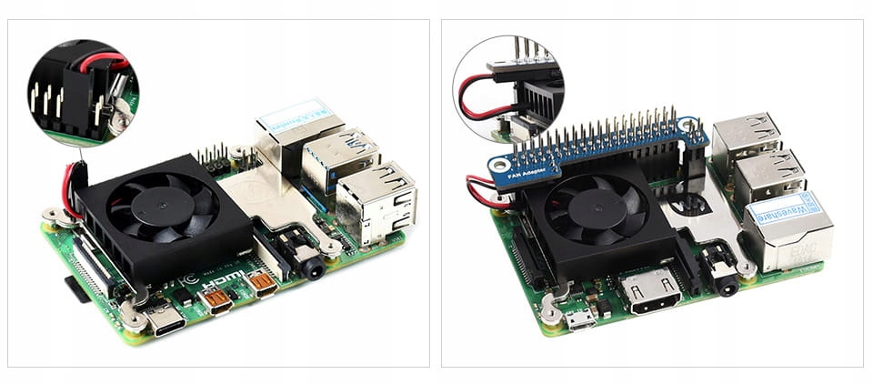 Кулер Raspberry Pi 4B (ліворуч) і Raspberry Pi 3B+/3B з адаптером GPIO (праворуч). Адаптер не входить.