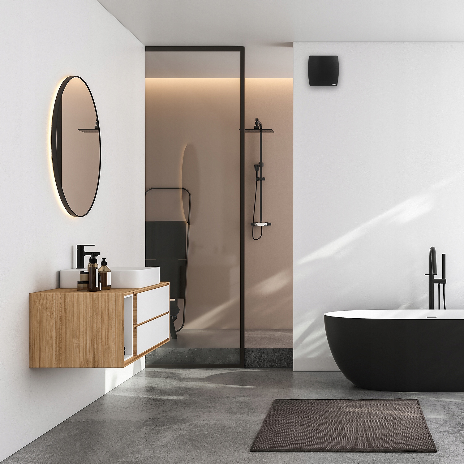EBERG AXI 100T - вентилятор для ванної кімнати, оснащений регульованою затримкою часу. Вентилятор починає працювати при активації вимикача світла або окремого вимикача. Після виходу з ванної кімнати вентилятор продовжує працювати встановлений час. Час затримки можна встановити від 30 секунд до 30 хвилин - вибране значення затримки буде підтверджено світлодіодним індикатором.