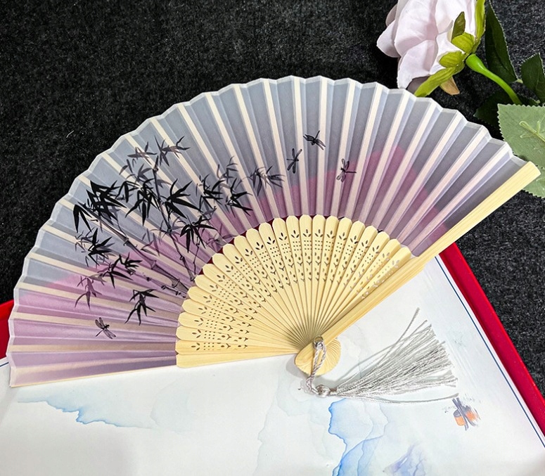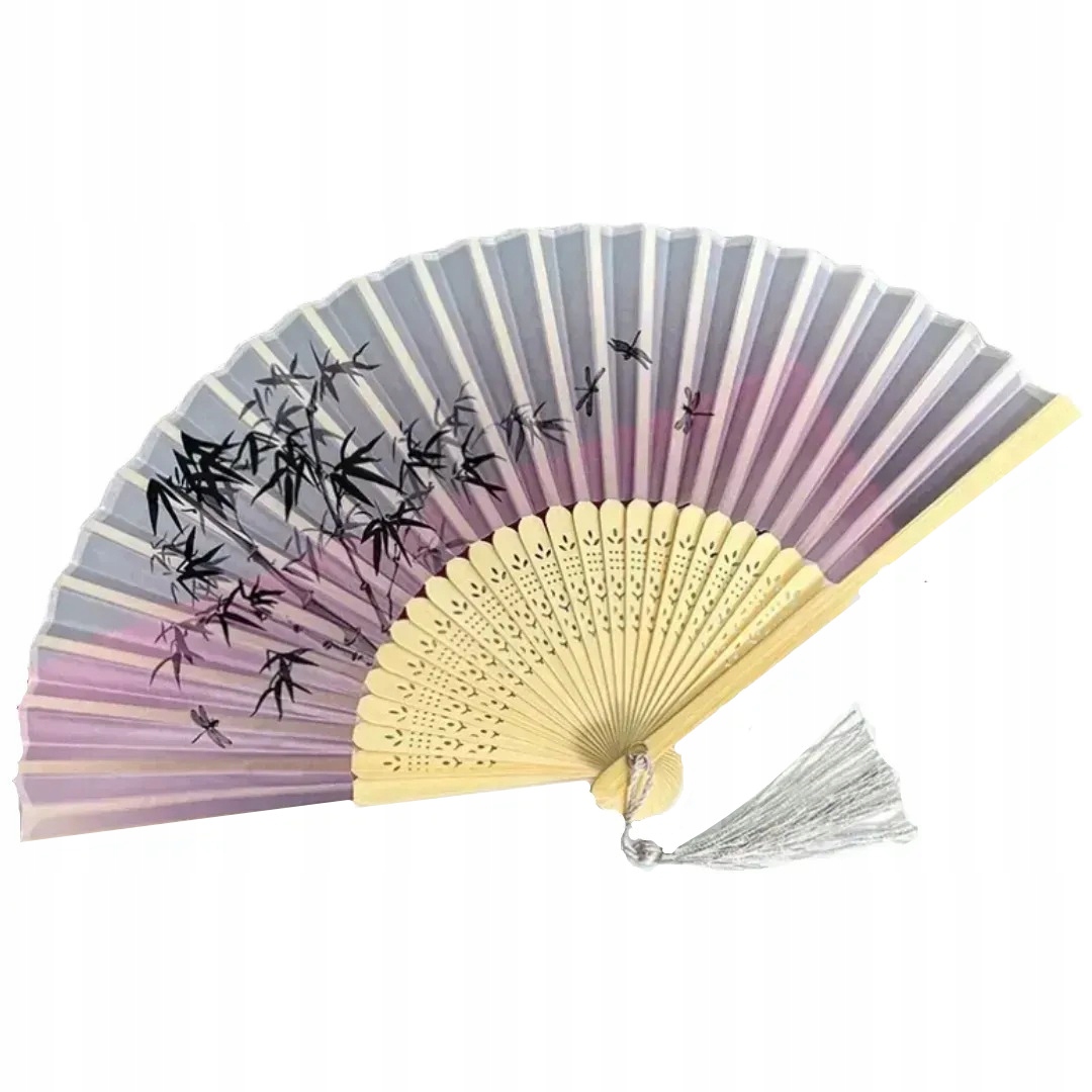 вентилятор з бамбуковим скелетом з різьбленими прикрасами та тканиною з барвистим принтом. Вентилятор не тільки надасть вам полегшення в спекотні літні дні, але також є чудовим доповненням до багатьох випадків. Наприклад, для карнавалу, тематичних подій, фотобудки або для розташування. Його також можна використовувати як декоративний елемент. Відкритий діапазон має розміри 21х38 див.