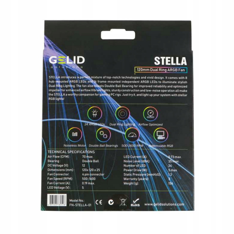 Stella (FN-STELLA-01) — це 120-мм подвійне кільце ARGB вентилятор. Він має 24 надяскраві світлодіоди ARGB з індивідуальною адресацією, які забезпечують приголомшливо яскраве RGB-освітлення, а завдяки незалежним світлодіодним масивам, встановленим на концентраторі та кільці, можливі необмежені динамічні колірні режими та ефекти RGB. Нова оптимізована лопатка крильчатки забезпечує більший потік повітря та менший шум. Шум клацання був усунутий завдяки новій конструкції та вдосконаленому контролеру двигуна, а ретельно відібрані подвійні шарикопідшипники найвищої якості забезпечують виняткову довговічність. Швидкість вентилятора була збільшена з 500 до 1600 об/хв. Він також характеризується широкою сумісністю - підтримуються всі сучасні материнські плати з керуванням RGB Sync і адресними роз’ємами RGB (ARGB) 5 В.