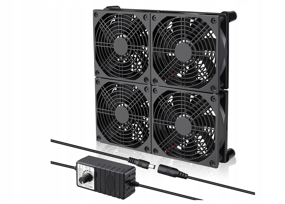 Параметр - Номінальна напруга: DC 12 В; Номінальний струм: 2.0AMP; Номінальна швидкість: 2000 об / хв; Потік повітря: 4x66CFM; Рівень шуму: 38 дБА; Роз’єм: DC 5,5 x 2,1 мм гніздо