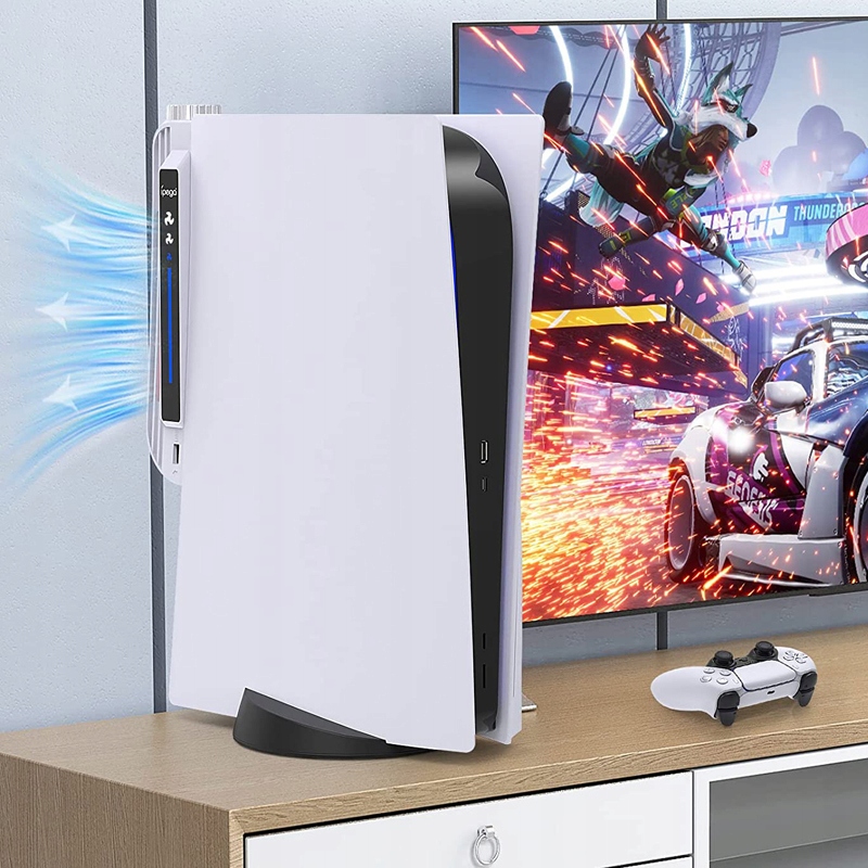 Модуль охолодження з вбудованим вентилятором ідеально вписується в стиль корпусу консоліі забезпечує ефективне зниження температури його компонентів ключових характеристик. Він має 3 регульовані швидкості охолодження, які можна адаптувати до поточних потреб пристрою під час використання консолі PS5.