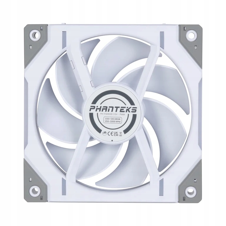 Phanteks PH-F120D30. Модель: вентилятор, діаметр головки вентилятора: 12 см, швидкість обертання (хв.): 250 об/хв, швидкість обертання (макс.): 2000 об/хв, рівень шуму (висока швидкість): 30,2 дБ, максимальний потік повітря: 64,3 фут³/хв, максимальна кількість повітря тиск: 3,01 мм H2O. Напруга: 12 В. Колір продукту: білий