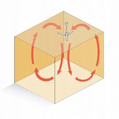 Але взимку він діє як опора для системи опалення, оскільки переміщує тепле повітря піднімається від стелі вниз, таким чином значно зменшуючи втрати тепла та витрати на опалення. Використовувані широкі вентиляційні лопаті забезпечують, що змішане повітря досягає навіть усіх кутів приміщення, усуваючи холодні кути.